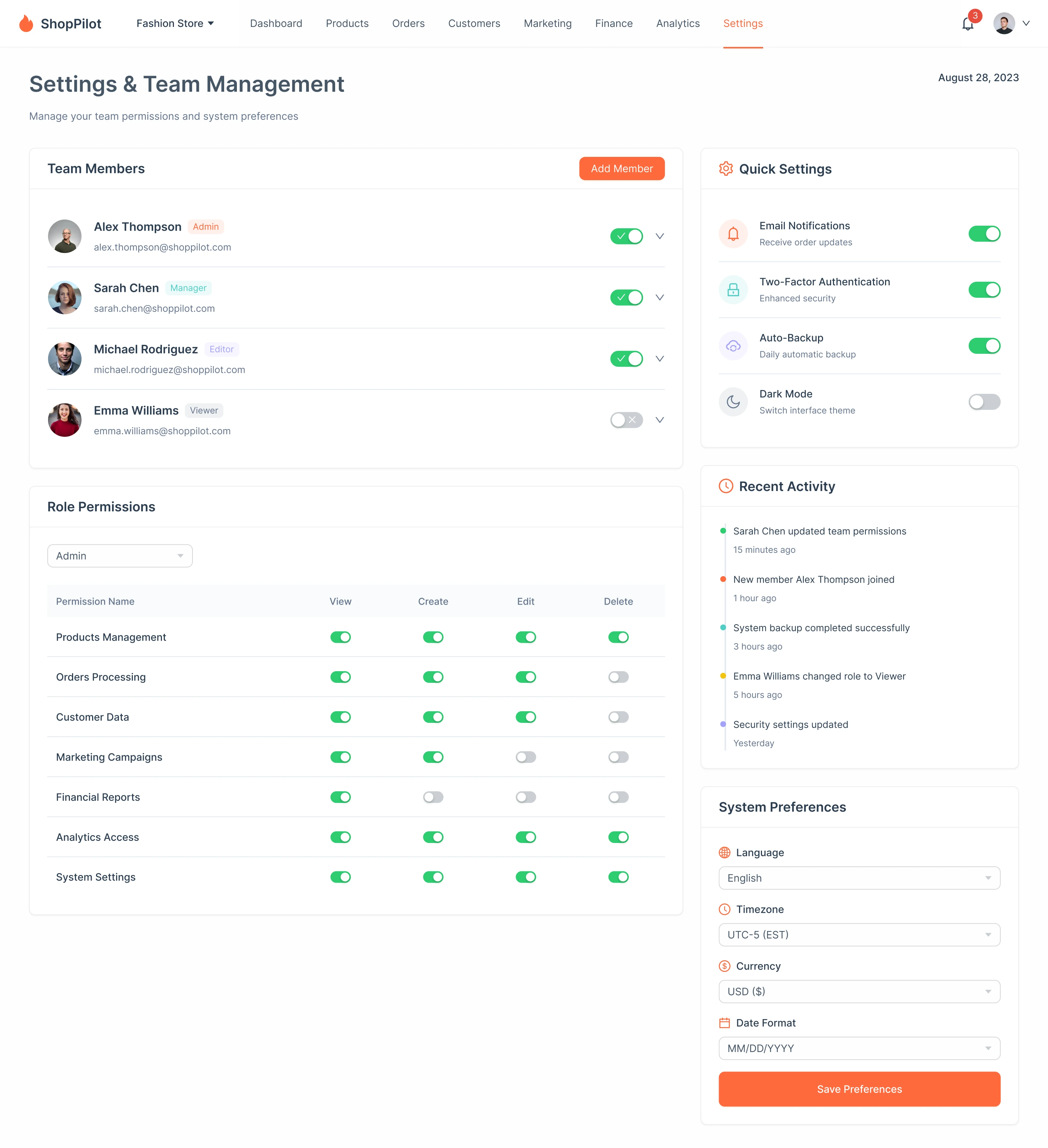 Top navigation bar displays Logo, Store switcher, main navigation (Dashboard / Products / Orders / Customers / Marketing / Finance / Analytics / Settings), message alerts, user menu.