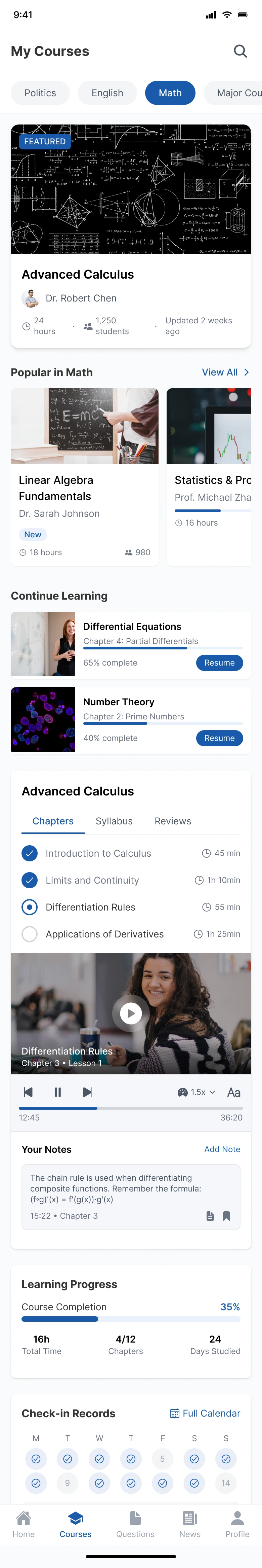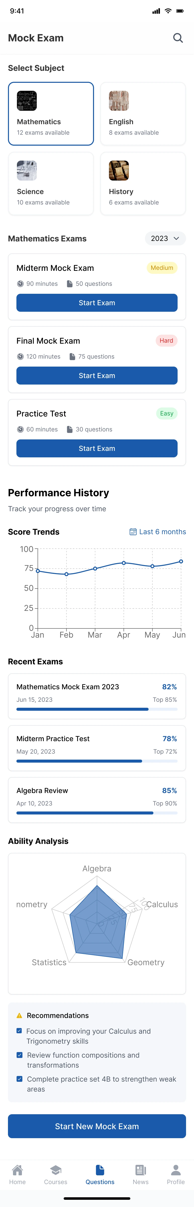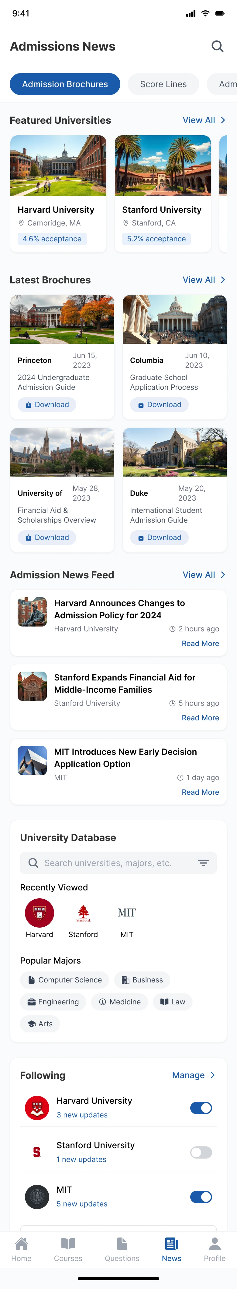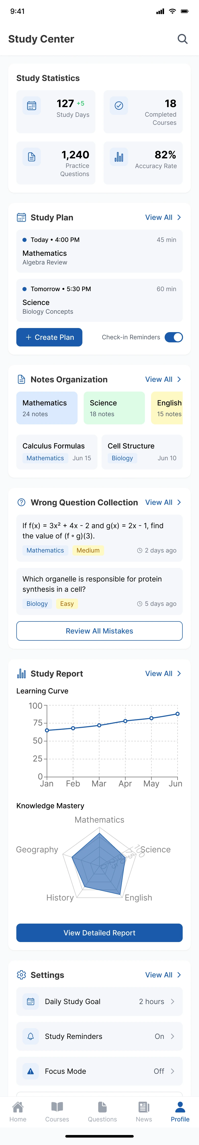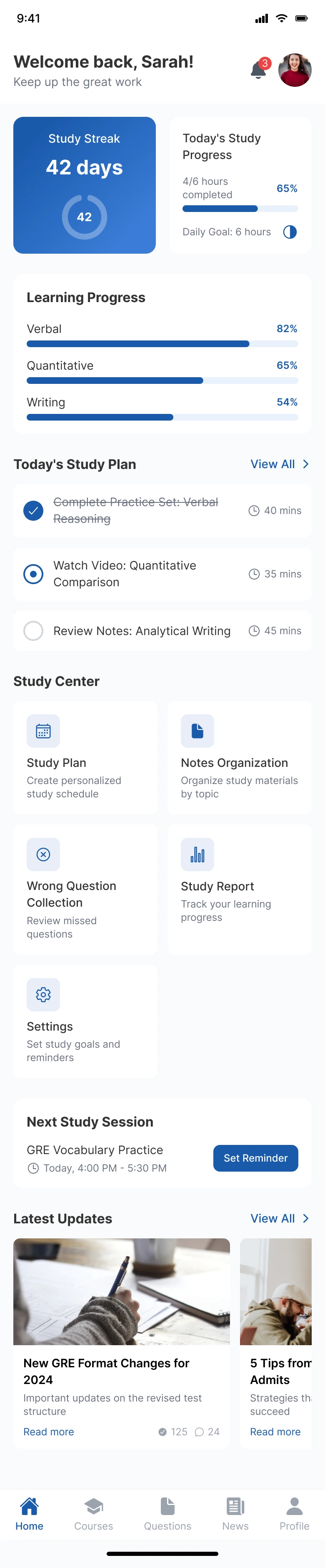 I need a graduate school prep app called GradPath. Start with the home page: Top displays exam countdown and today's study progress. Below shows study plan, daily tasks, and recommended courses. Quick access includes Practice Questions, Expert Courses, Resource Library, and Study Groups. Displays admissions news and prep articles. Bottom nav: Home, Courses, Questions, News, and Profile (current: Home). Visual style: GradCafe/PrepScholar: Academic blue, study materials, progress bars, scholarly theme