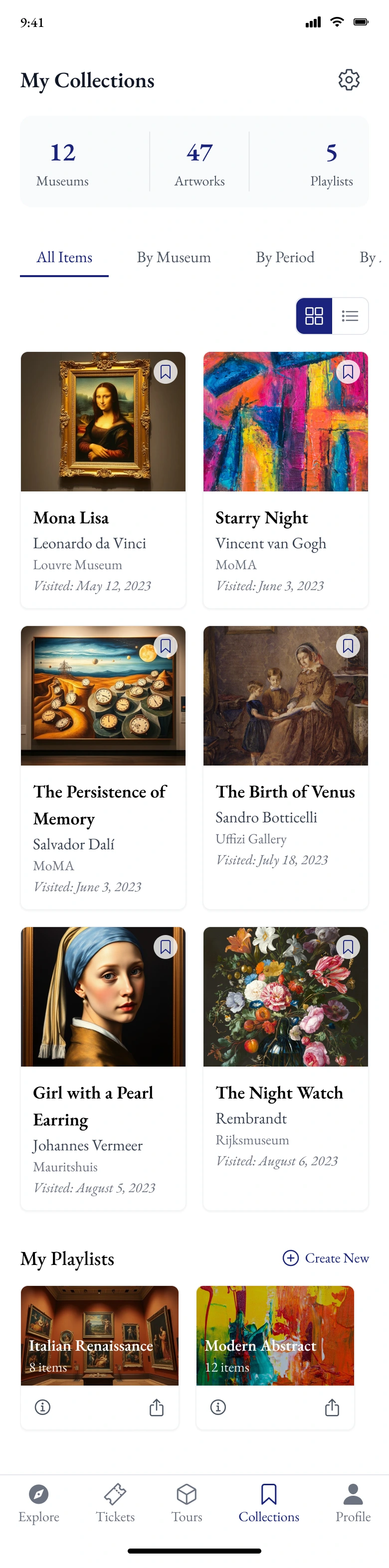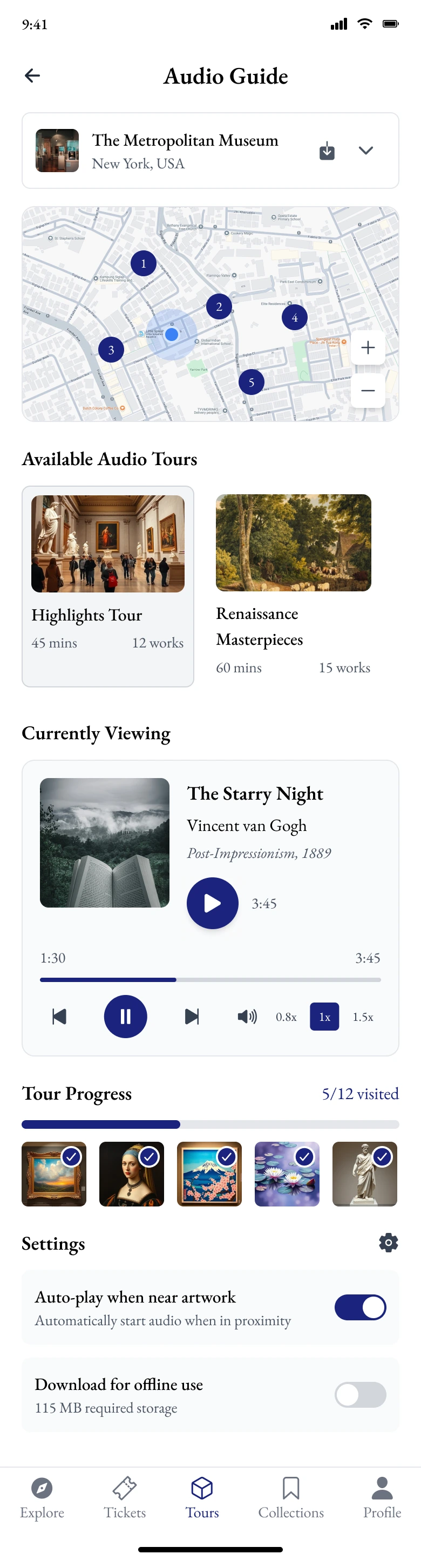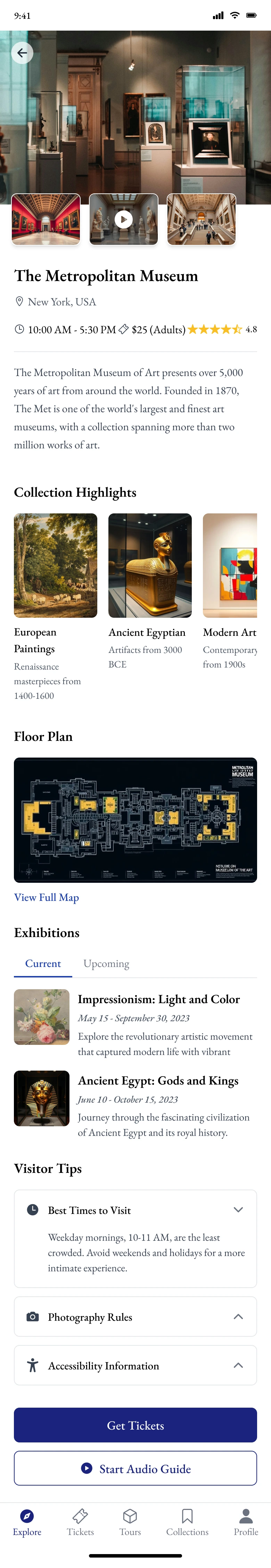 I need a museum guide app called MuseumTour. Start with the home page: Top search bar and location-based museum discovery. Below shows nearby museums, featured exhibitions, and virtual tours. Quick access includes Audio Guides, Exhibition Calendar, Ticket Booking, and AR Experience. Displays art and culture news. Bottom nav: Explore, Tickets, Tours, Collections, and Profile (current: Explore). Visual style: Google Arts/The Met App: Cultural sophistication, artifact imagery, gallery view, educational elegance
