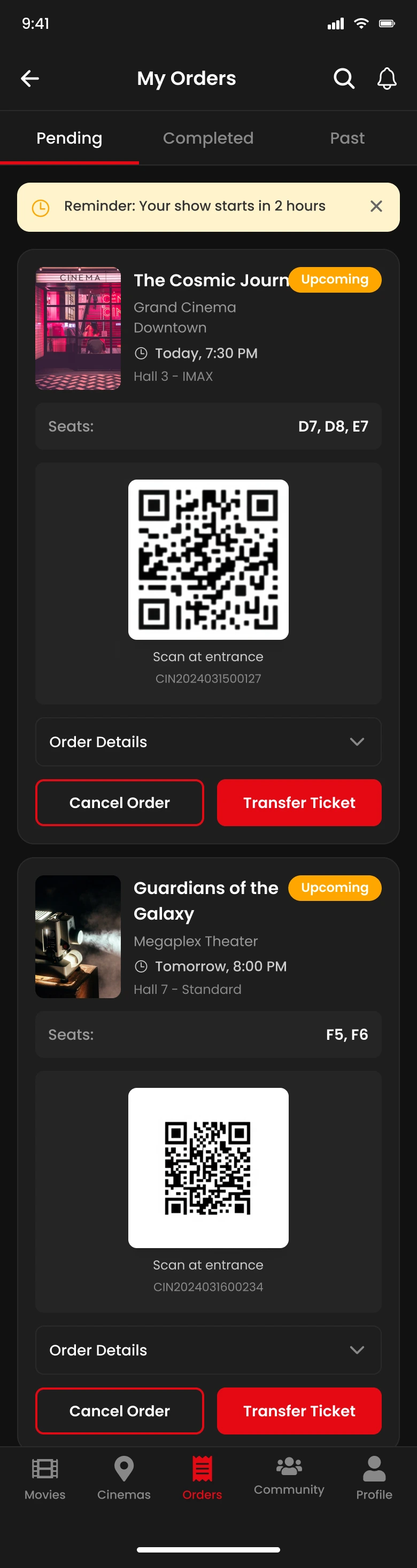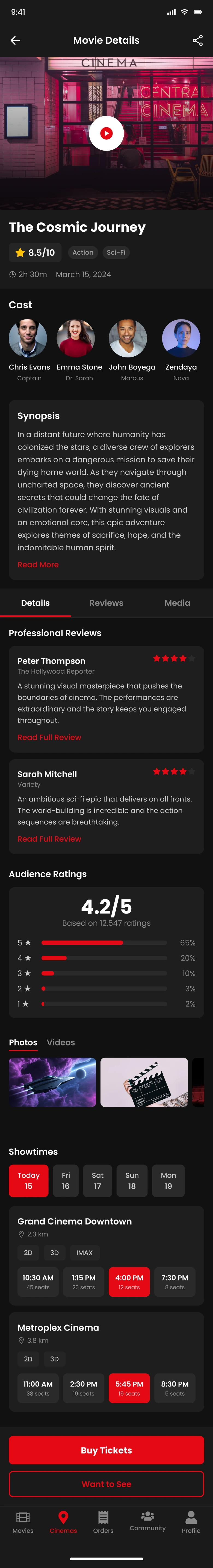 I need a movie ticketing app called CinemaClub. Start with the home page: Top banner displays featured movies and promotions. Below shows now showing, coming soon, and trending movies. Each movie card shows poster, title, rating, genre, and runtime. Quick access includes Nearby Cinemas, My Tickets, and Membership. Displays movie news and reviews. Bottom nav: Movies, Cinemas, Orders, Community, and Profile (current: Movies). Visual style: Fandango/Atom Tickets: Cinema red-black, movie posters, showtime grids, entertainment vibe