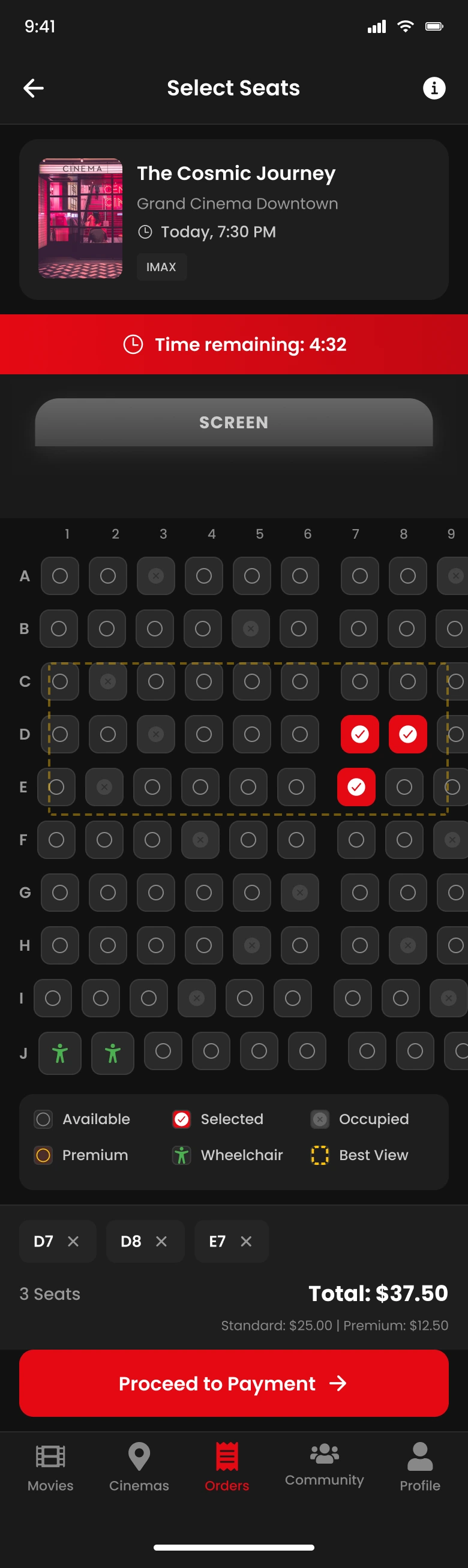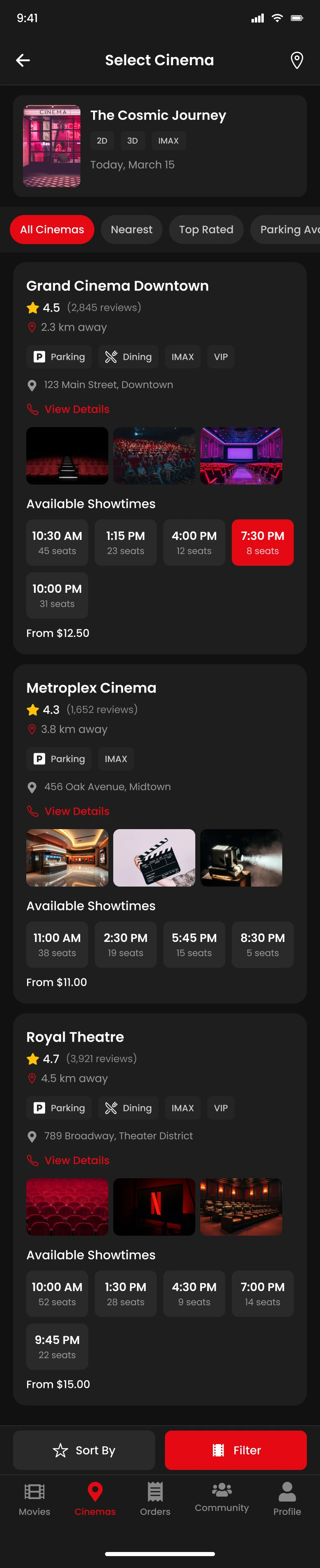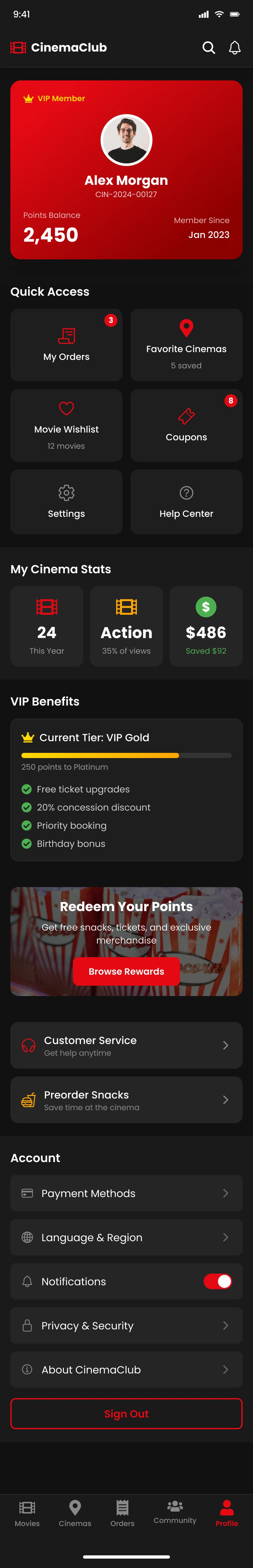 CinemaClub is a movie ticketing app designed to help users browse movies, select seats, and purchase tickets. This case showcases a complete cinema booking platform with cinema red-black theme, including home page, movie details, cinema selection, seat selection, order management, and profile pages, referencing Fandango and Atom Tickets.