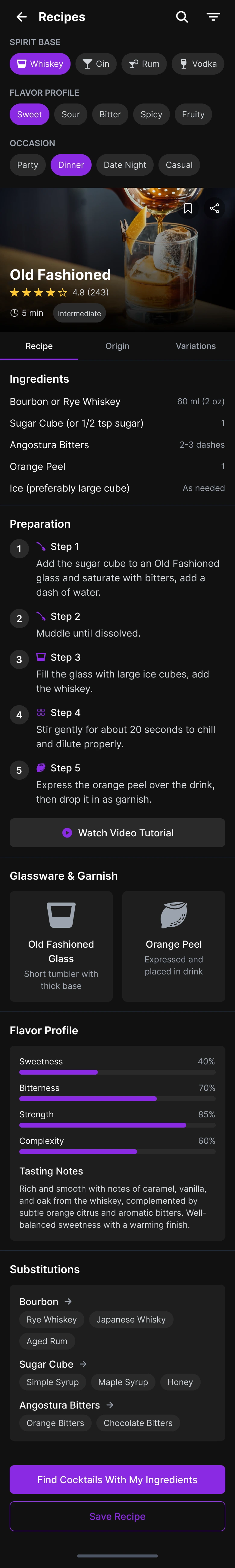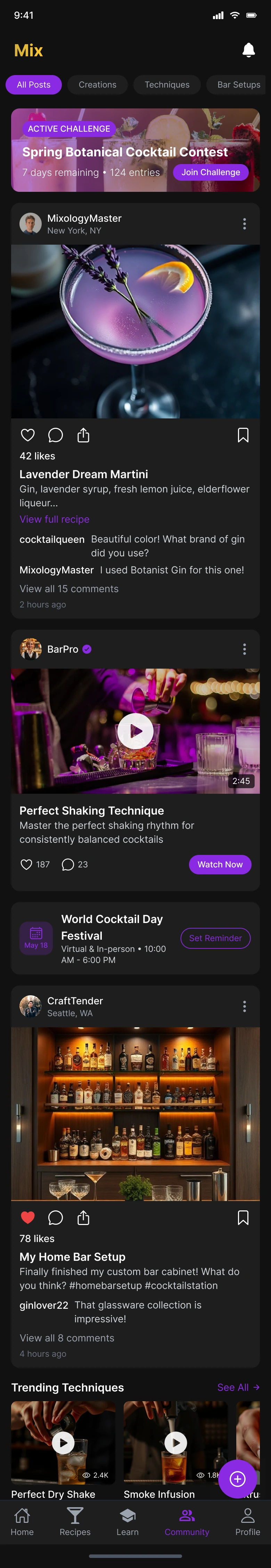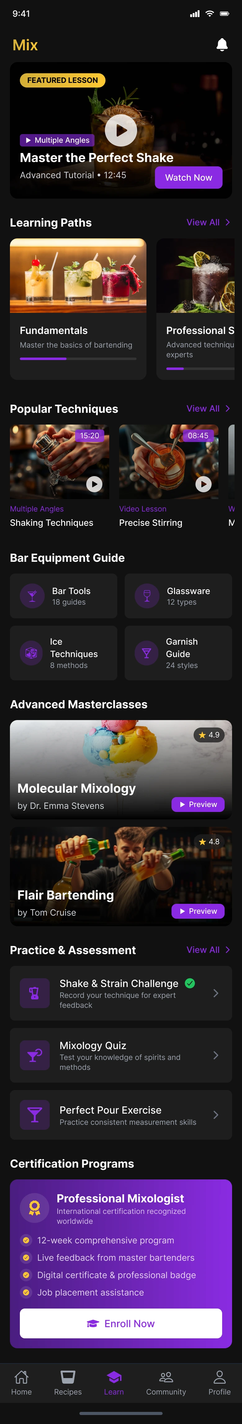 I need a bartending learning app called Mix. Start with the home page: The top displays cocktail of the day and mixing challenges. Below shows cocktail library, video tutorials, and bartender community. Quick access includes Recipe Search, Techniques, Bar Tools, and Cocktail Quiz. Displays mixology news and bar trends. Bottom nav: Home, Recipes, Learn, Community, and Profile (current: Home). Visual style: Cocktail Flow/Mixology: Bar dark theme, drink recipes, ingredient lists, nightlife aesthetic