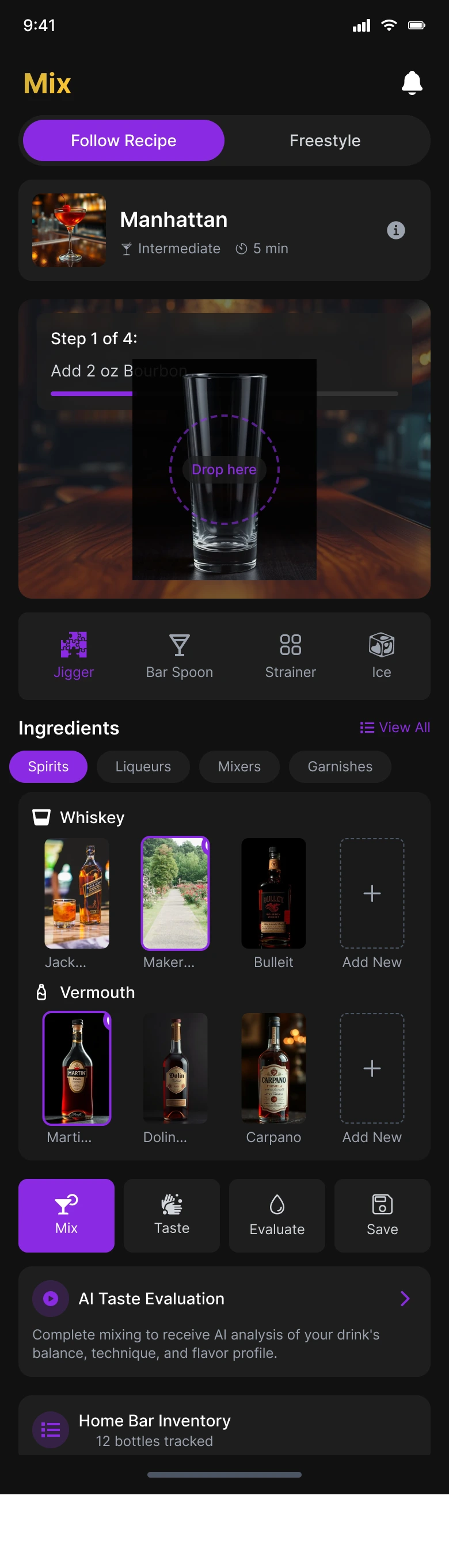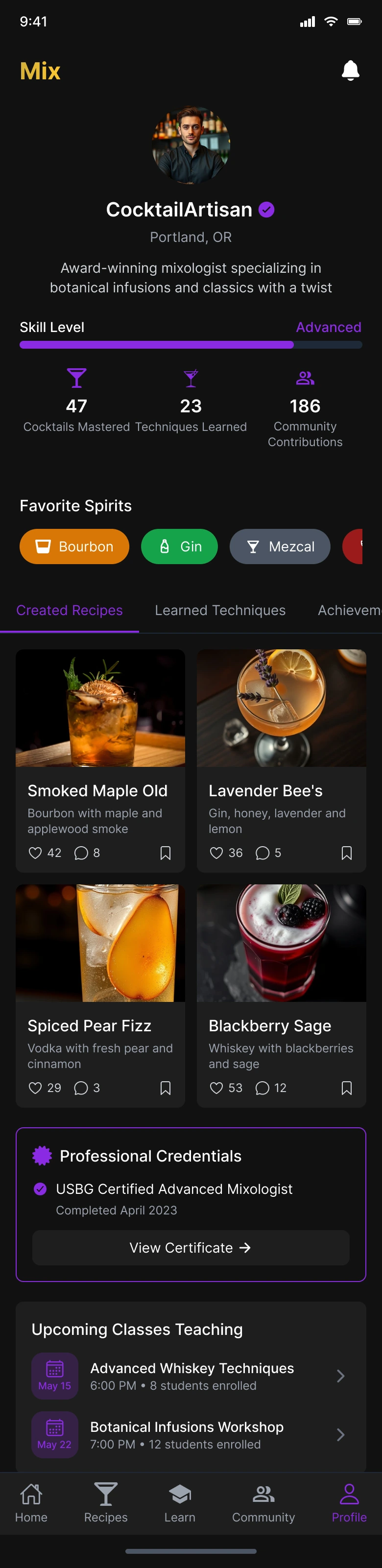 Mix is a bartending learning app designed to help users learn cocktail recipes, practice techniques, and connect with bartender community. This case showcases a complete mixology platform with nightlife aesthetic, including home page, cocktail recipe, techniques & skills, virtual bar, bartender community, and profile pages, referencing Cocktail Flow and Mixology.