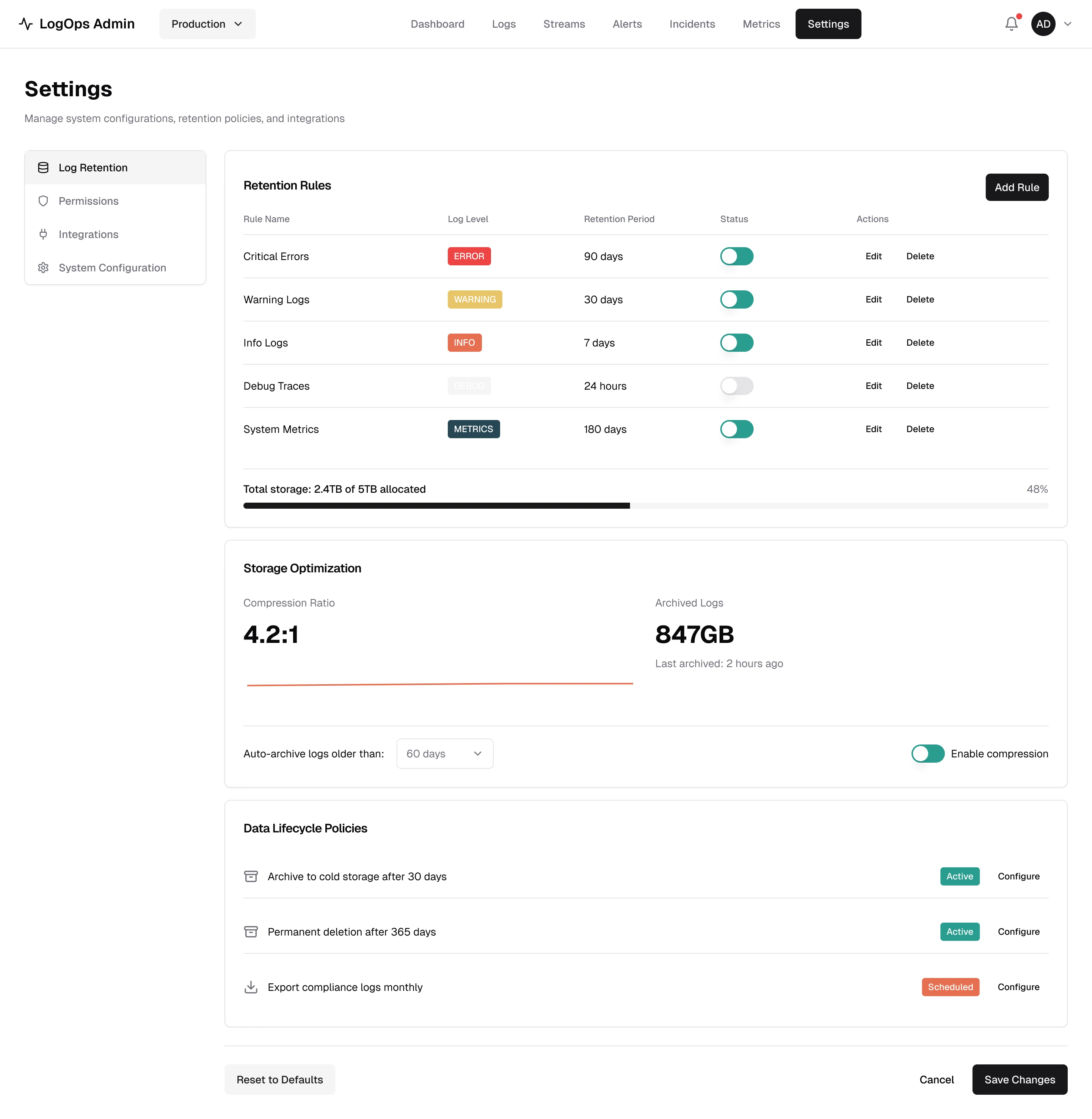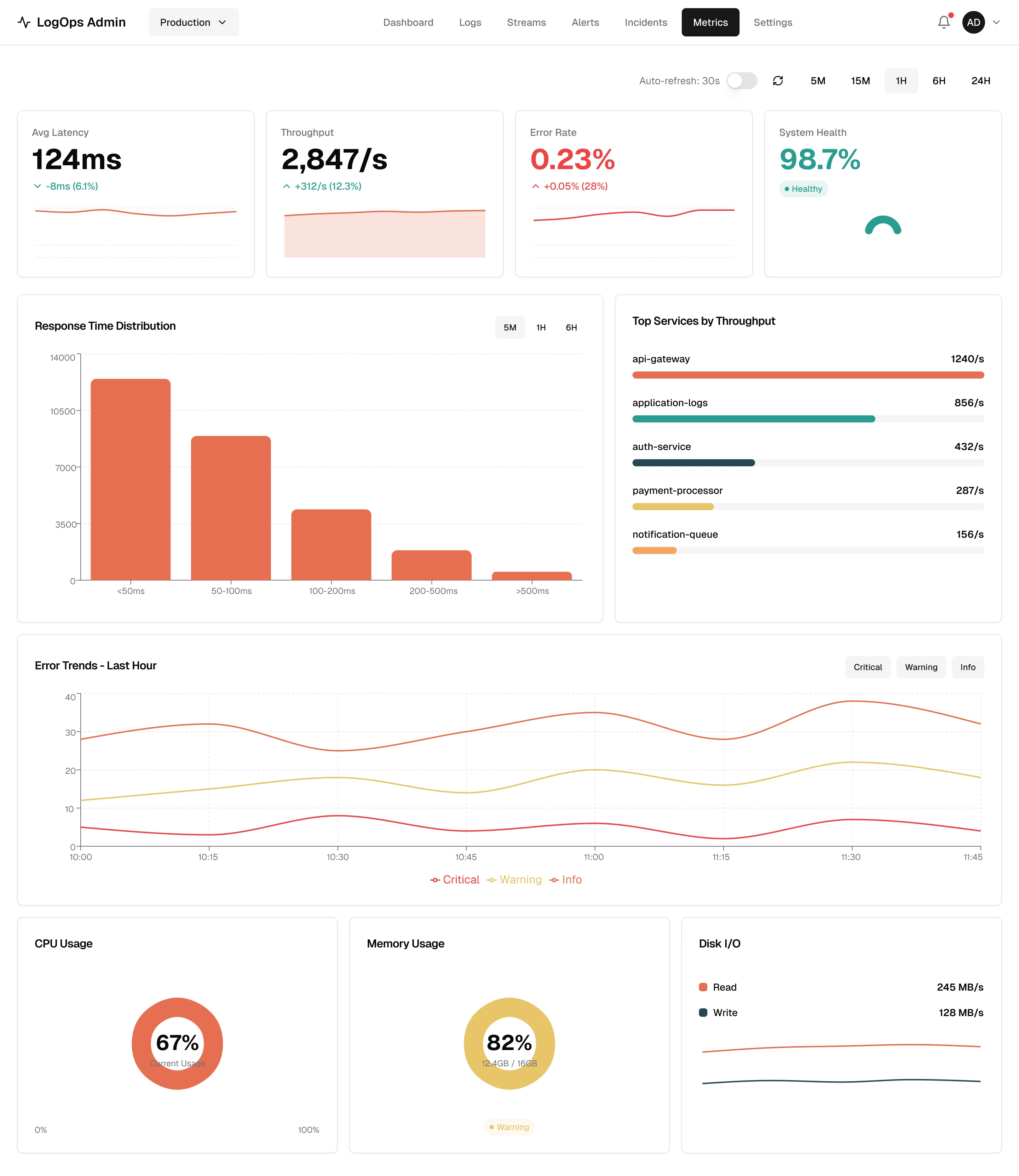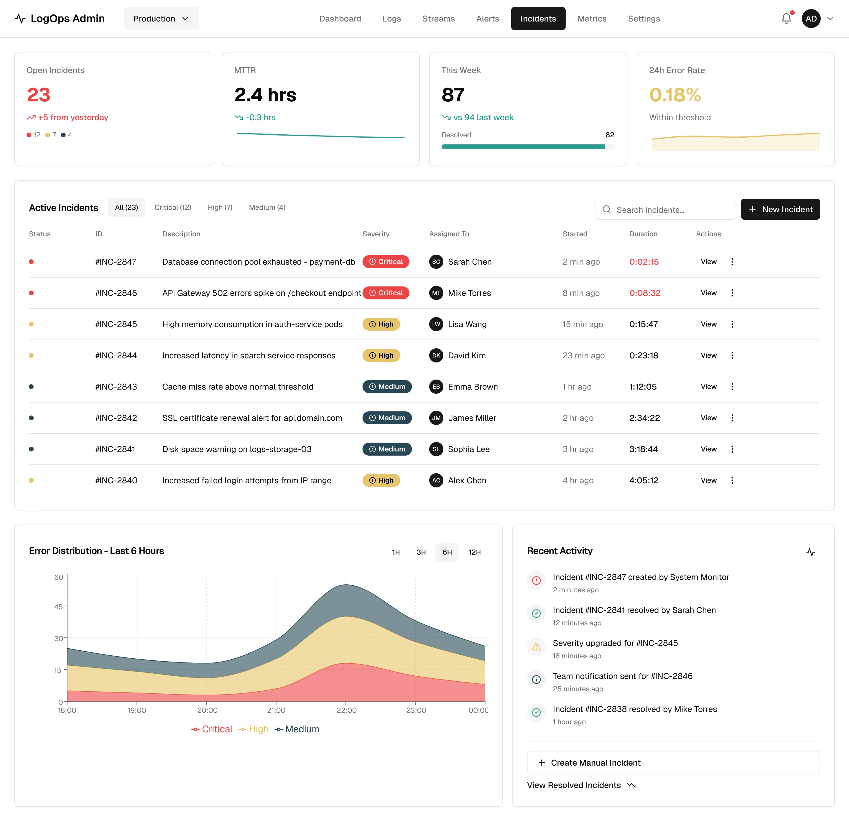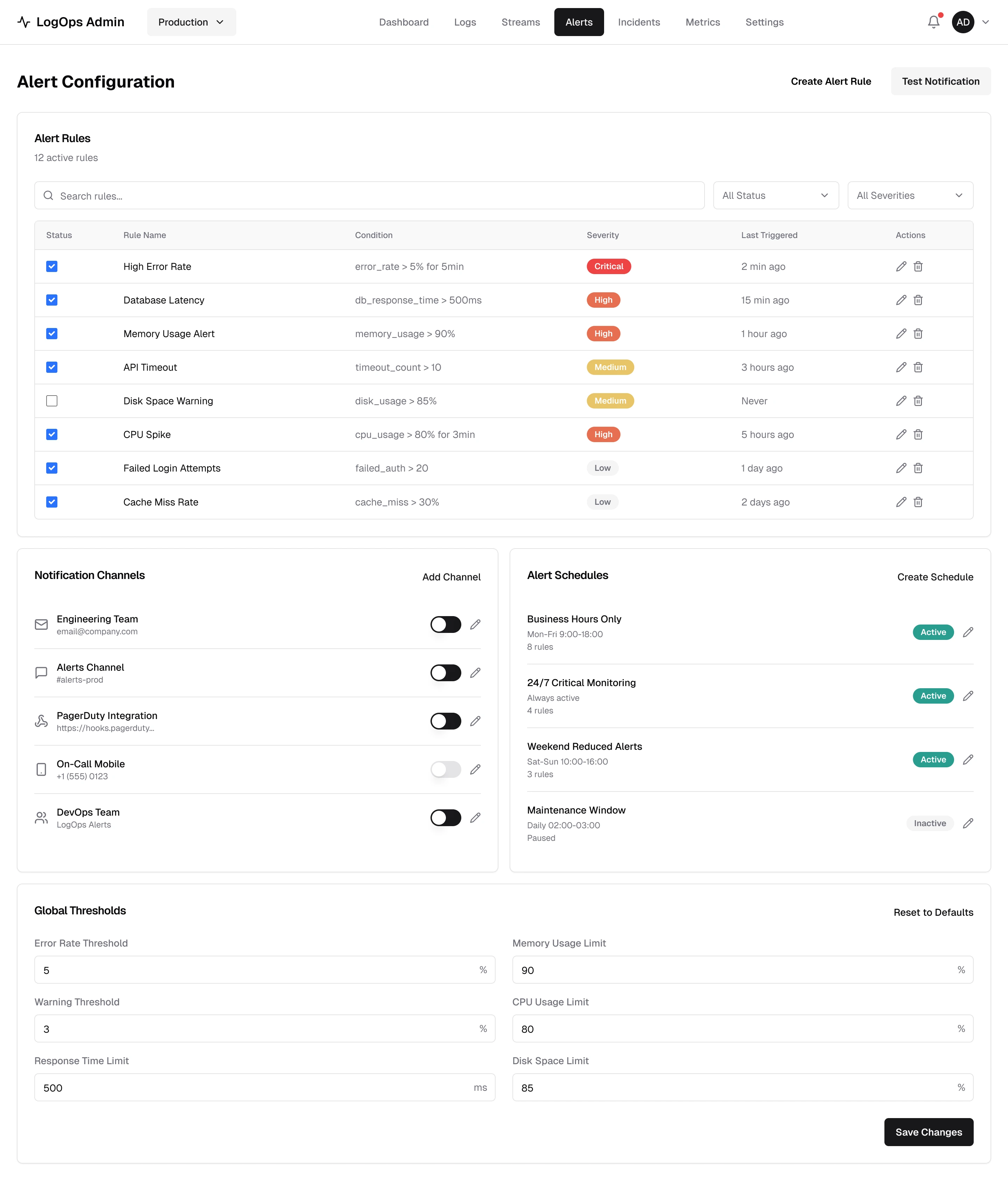 LogOps Admin is a web-based logging system designed for comprehensive log management and monitoring. This case showcases a complete logging platform with high-clarity black-white UI designed for dense data readability, including dashboard overview, log stream with real-time monitoring, error and incident management, alerts configuration, metrics monitoring, and settings pages.