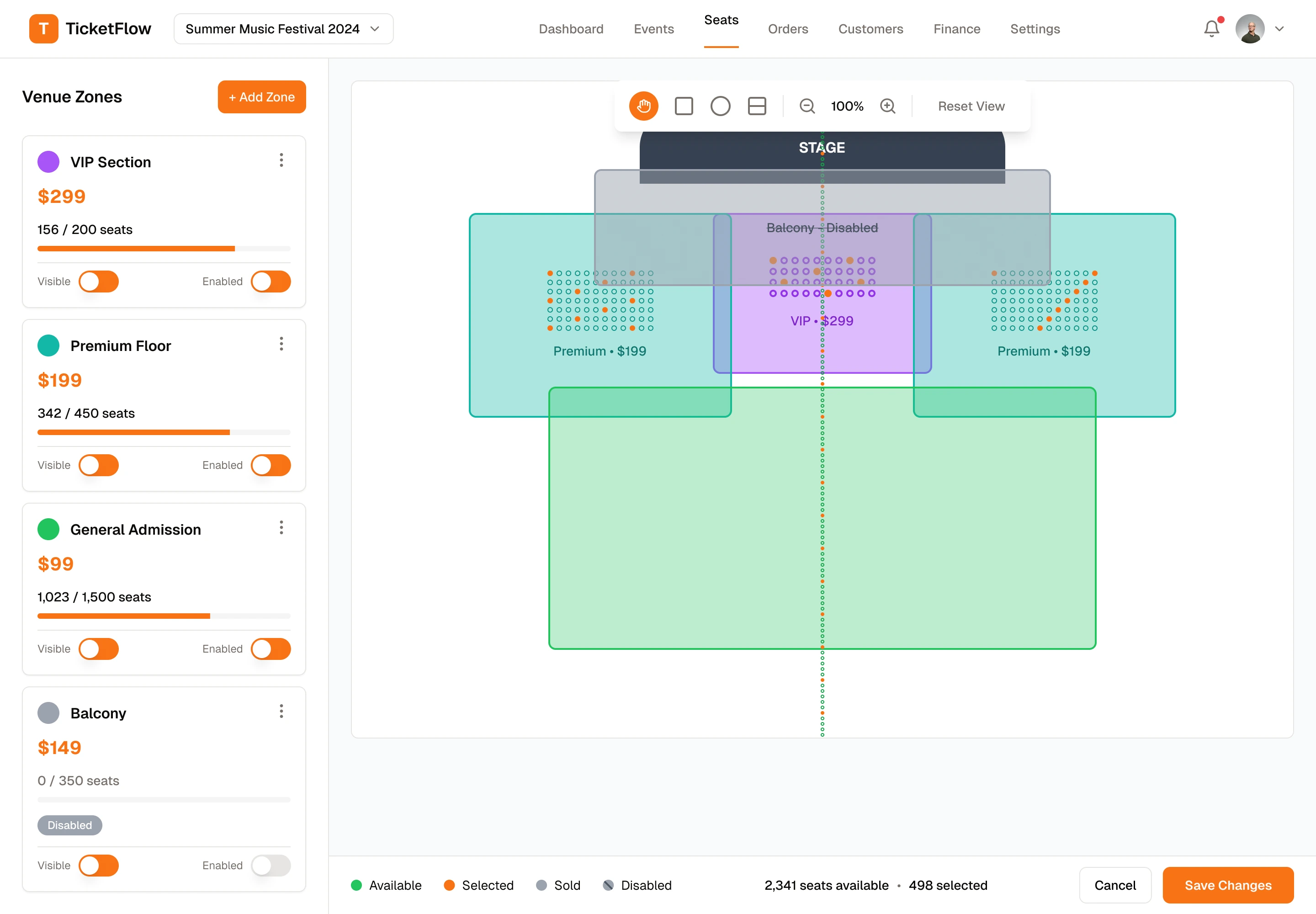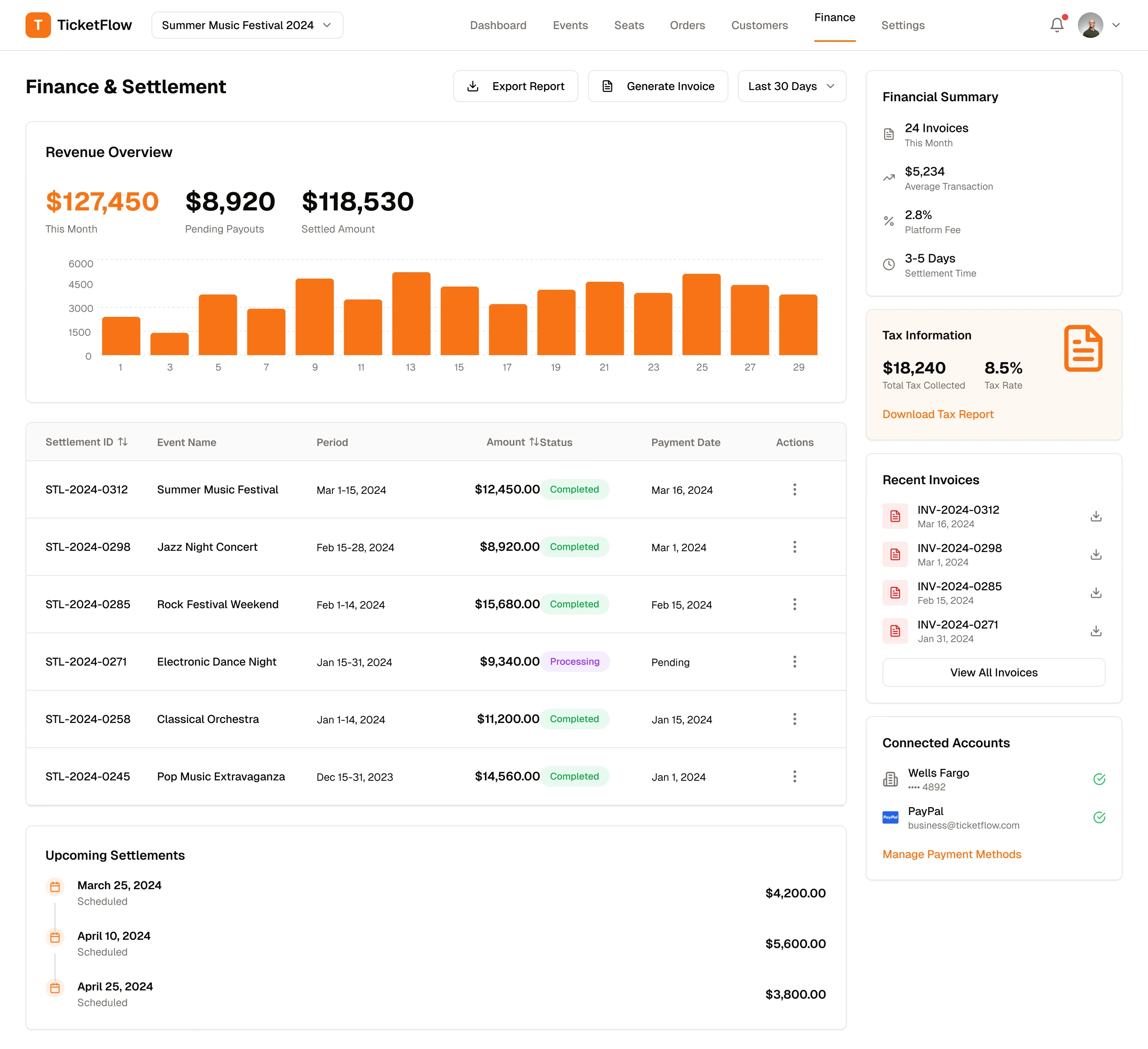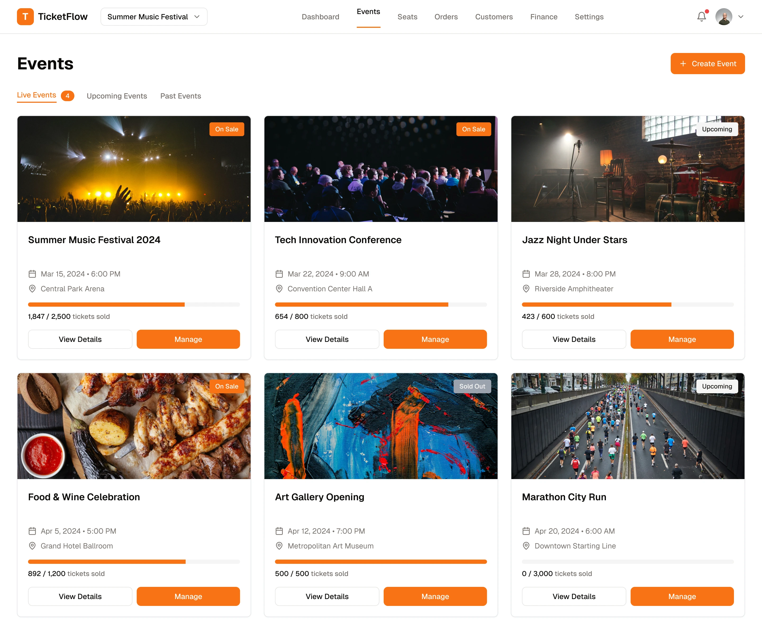 TicketFlow is a web-based ticketing management system designed for comprehensive event and ticket operations. This case showcases a complete ticketing platform with lively purple-orange event theme featuring gradient headers and soft card shadows, including dashboard overview, event management, seating and venue mapping, order management, customer management, finance and settlement, and settings pages.