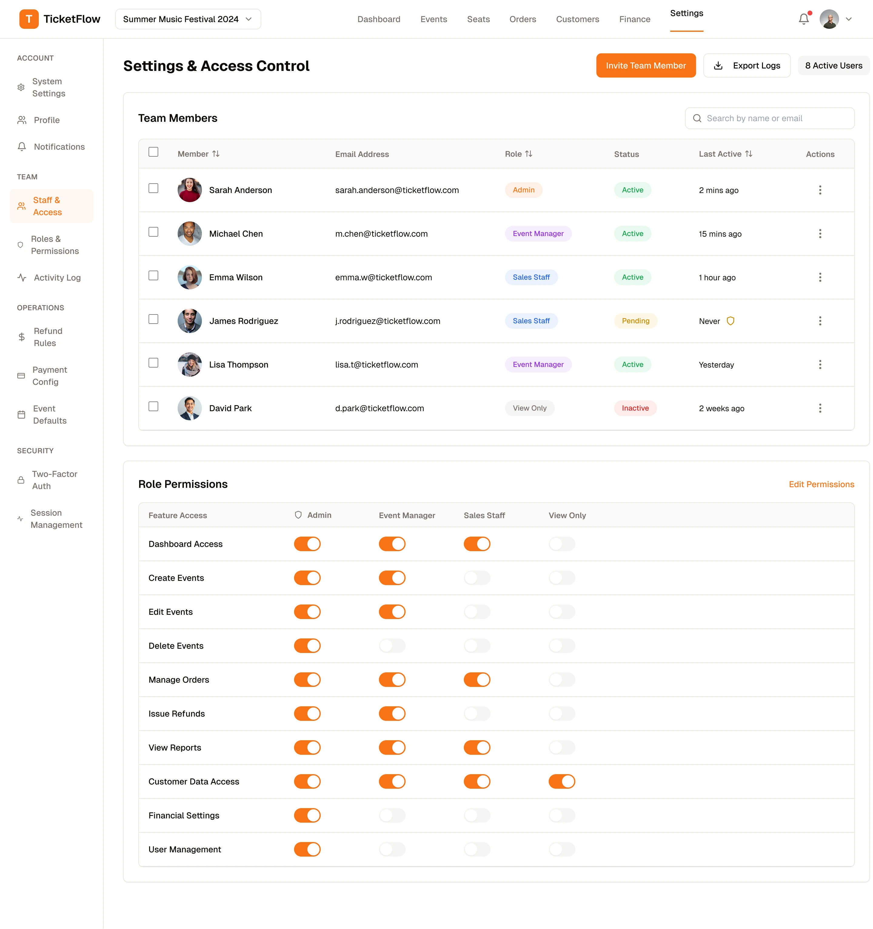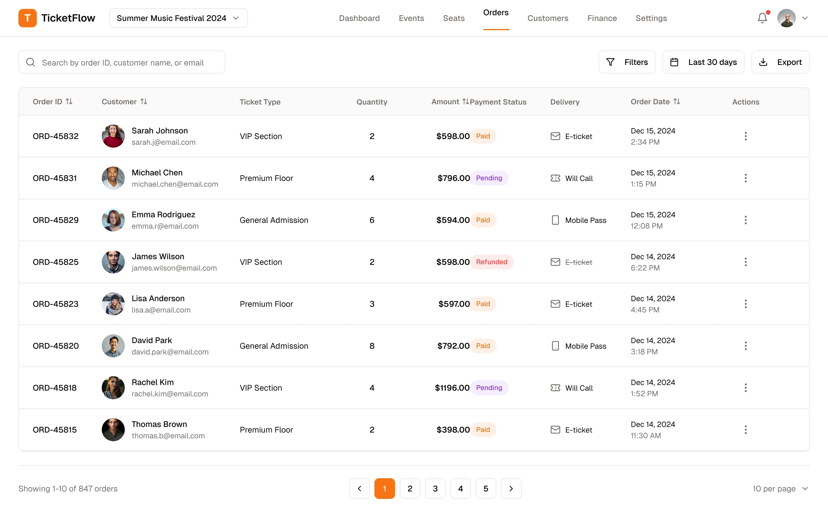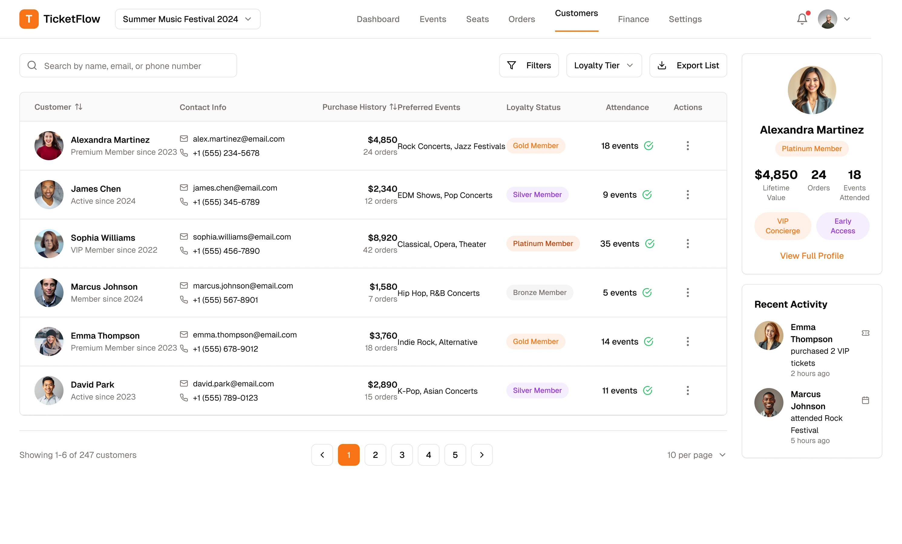 TicketFlow is a web-based ticketing management system designed for comprehensive event and ticket operations. This case showcases a complete ticketing platform with lively purple-orange event theme featuring gradient headers and soft card shadows, including dashboard overview, event management, seating and venue mapping, order management, customer management, finance and settlement, and settings pages.