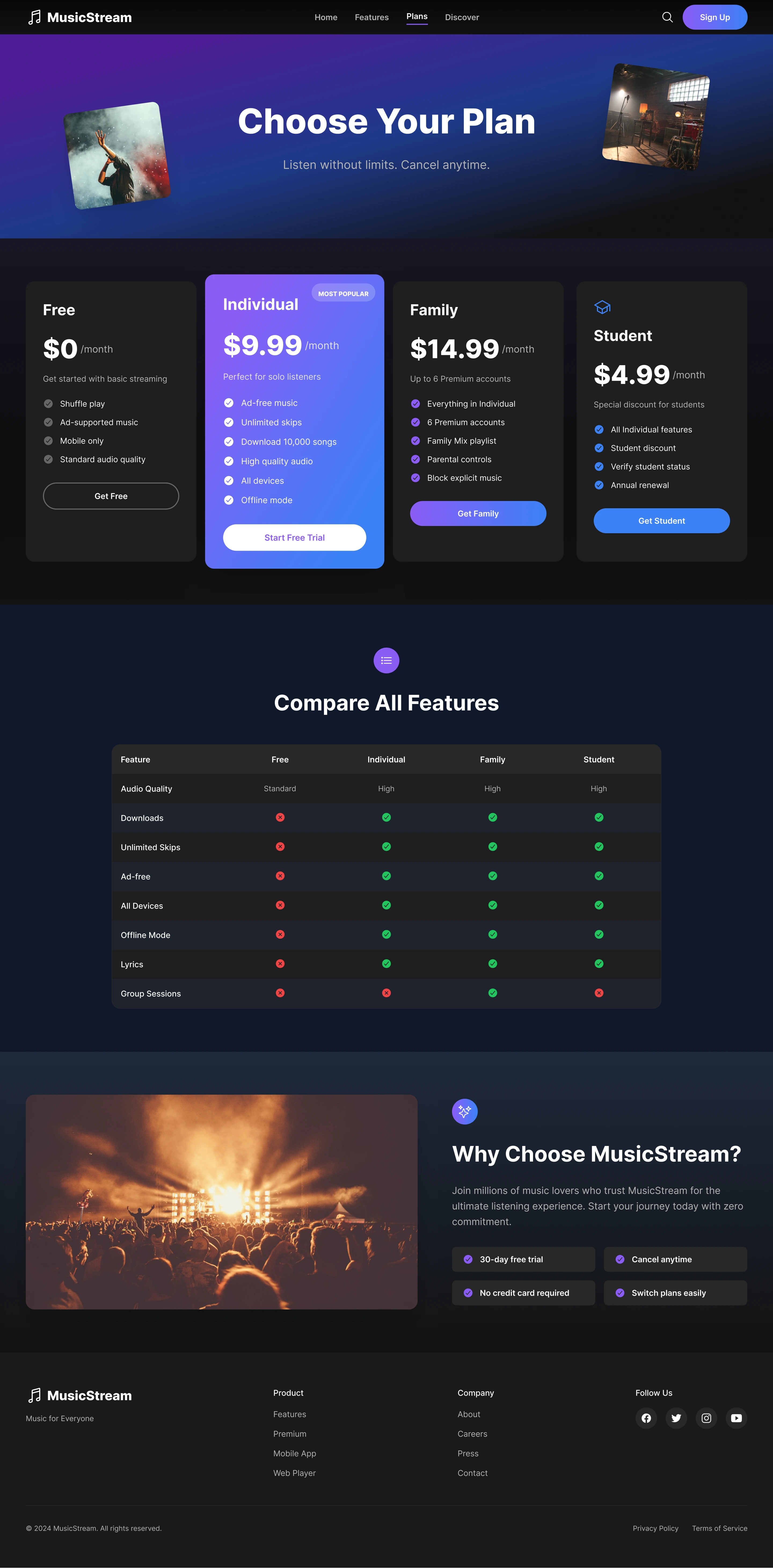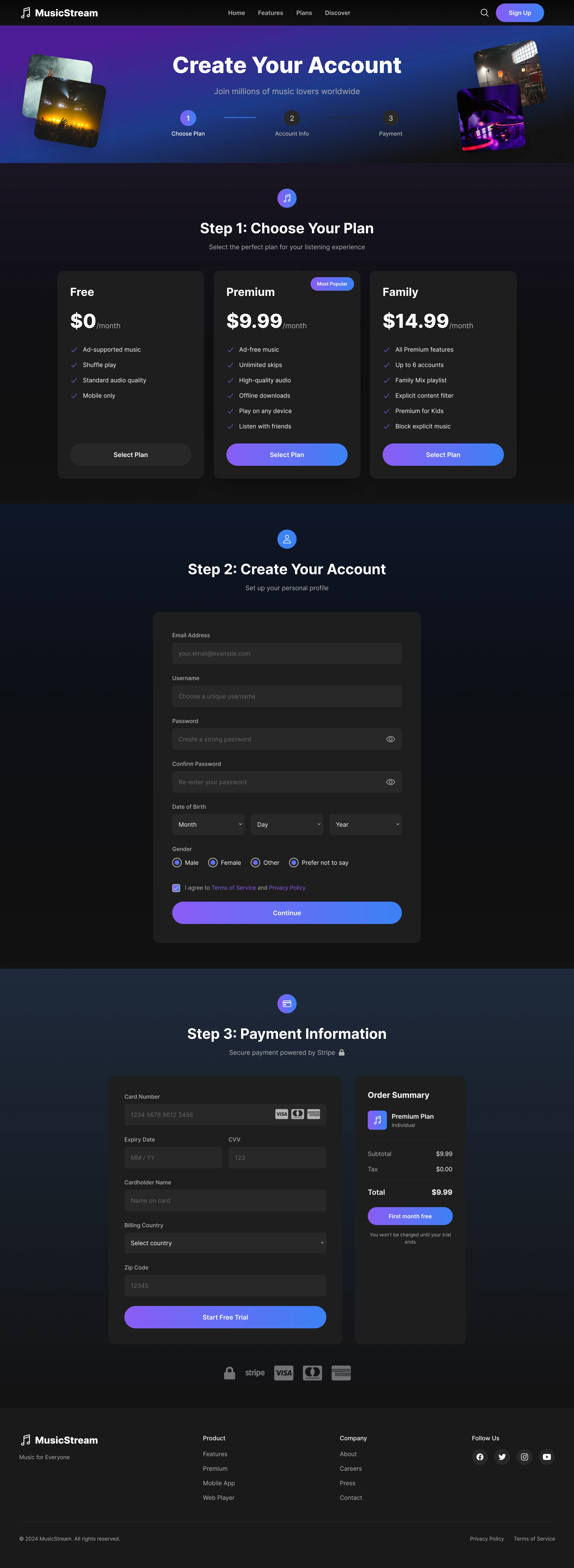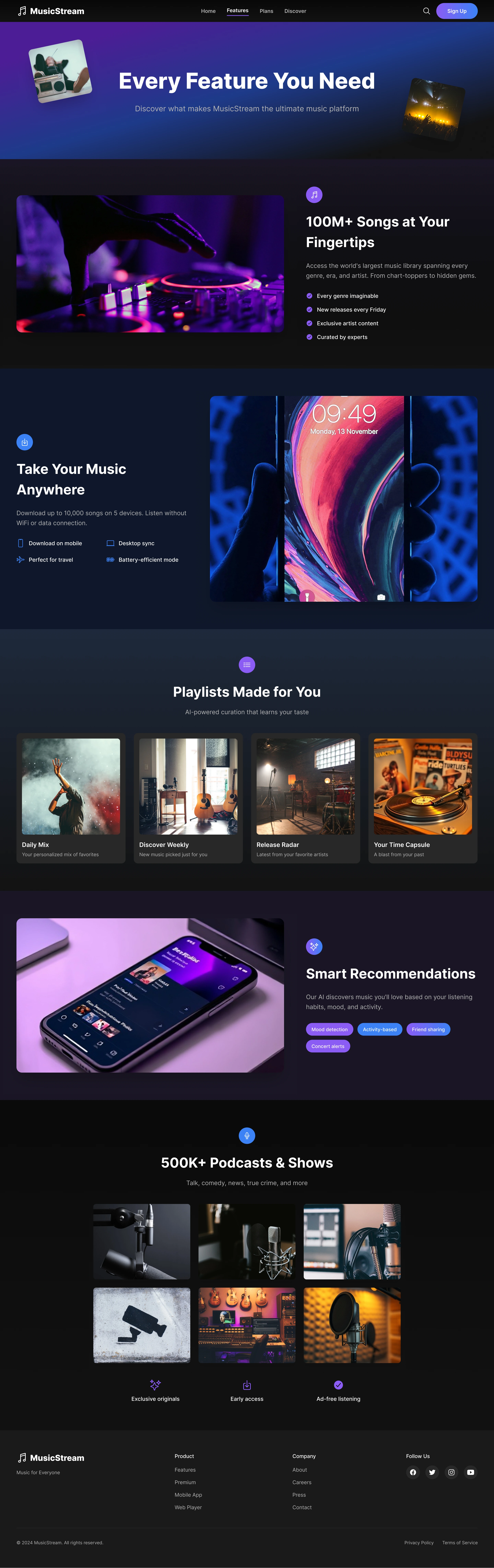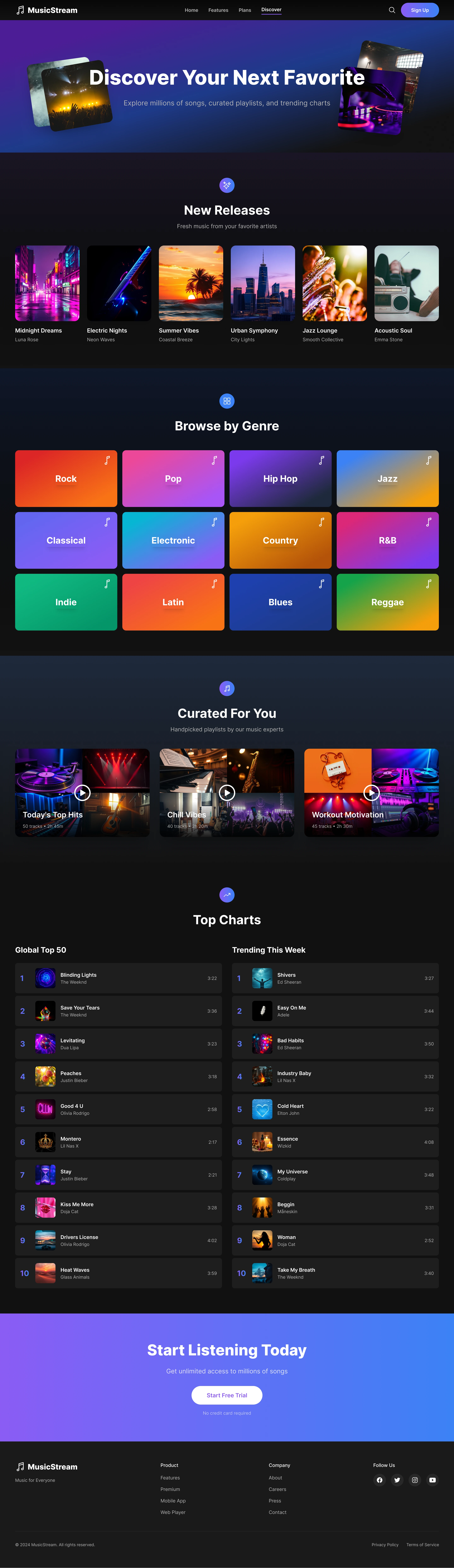 MusicStream is a music streaming website designed to drive subscription sign-ups. This case showcases a complete streaming service site, including homepage with music player, features overview, subscription plans, music discovery, and sign-up pages, with a music streaming style, album art focused and modern design, referencing Spotify.