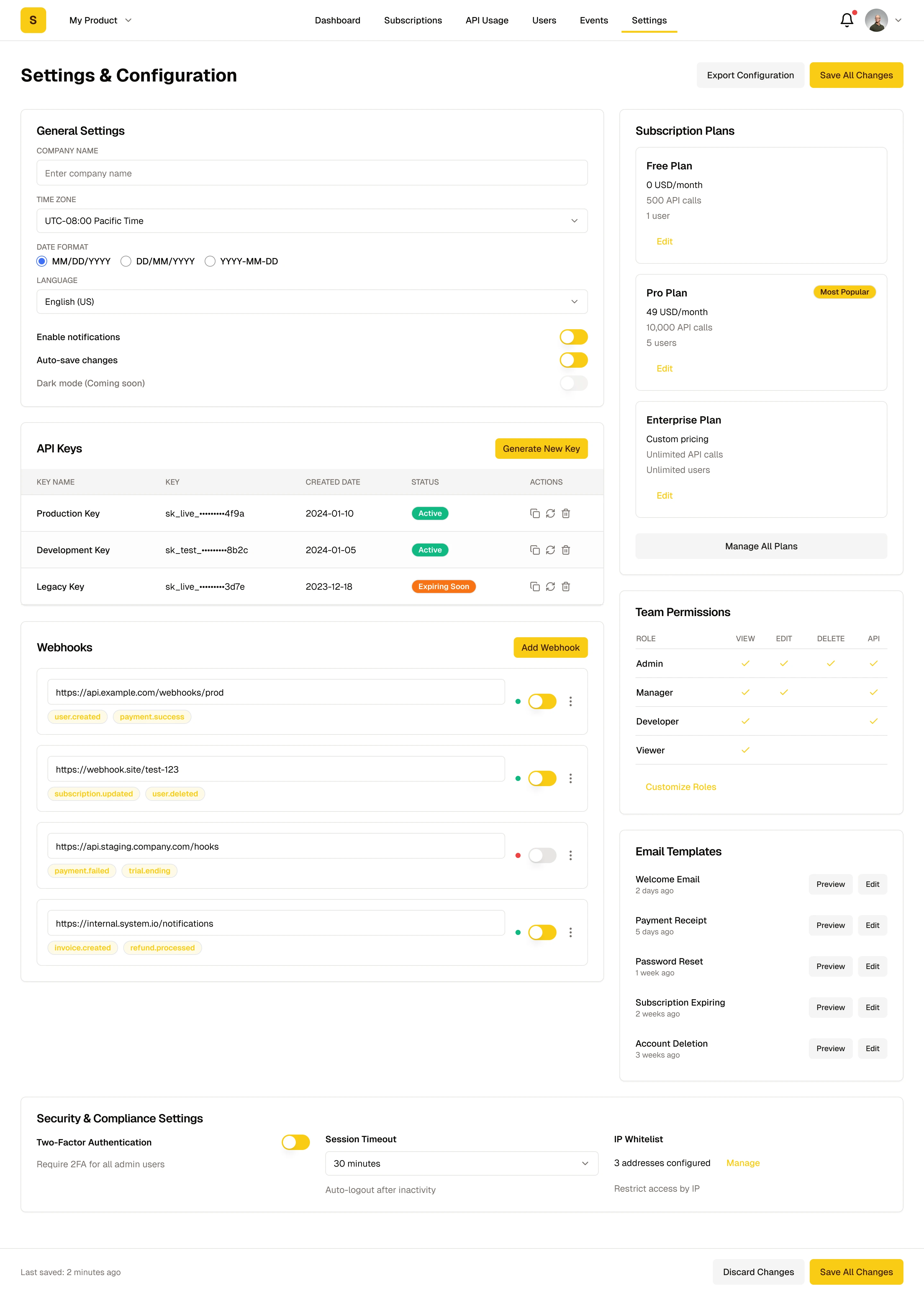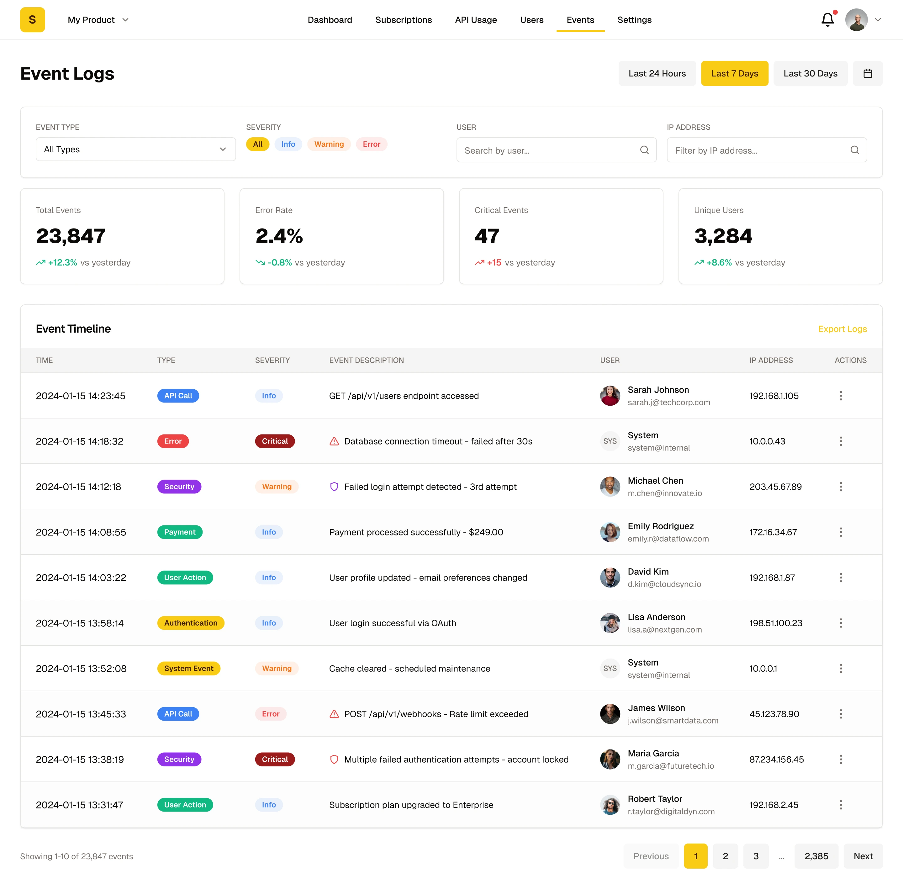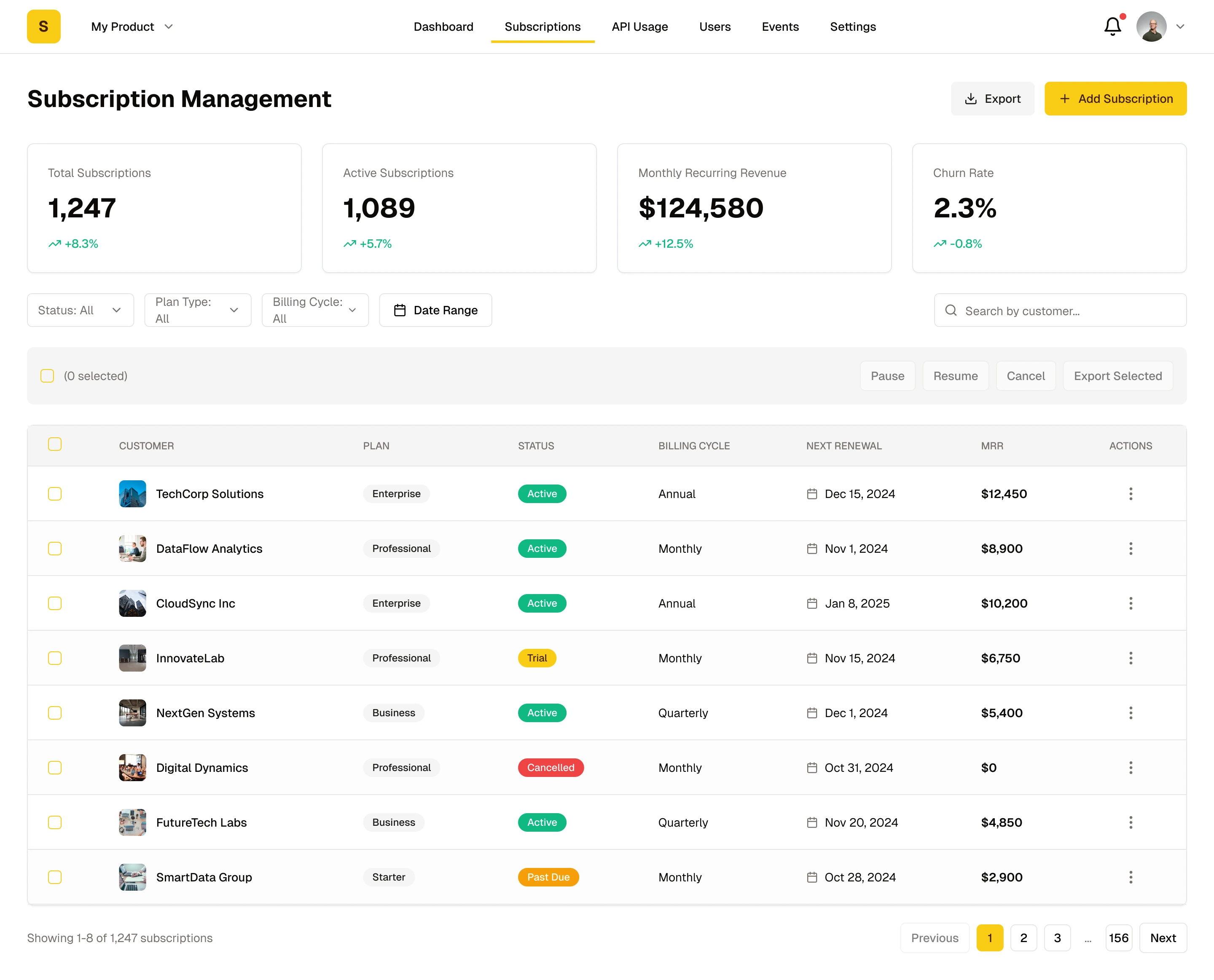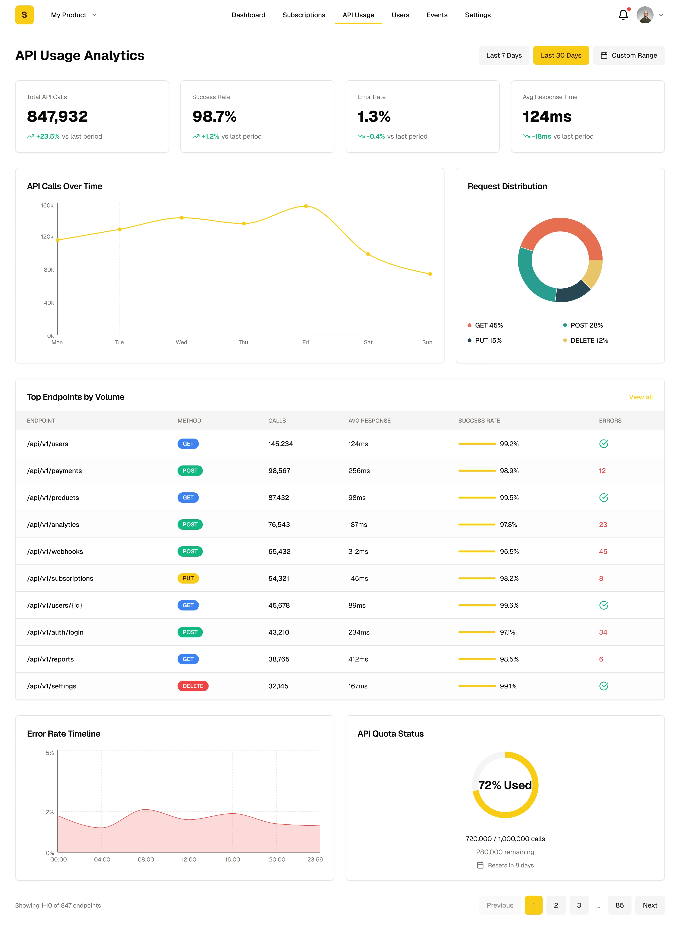 Top navigation bar displays Logo, product selector, main navigation (Dashboard / Subscriptions / API Usage / Users / Events / Settings), notification bell, and user profile menu.