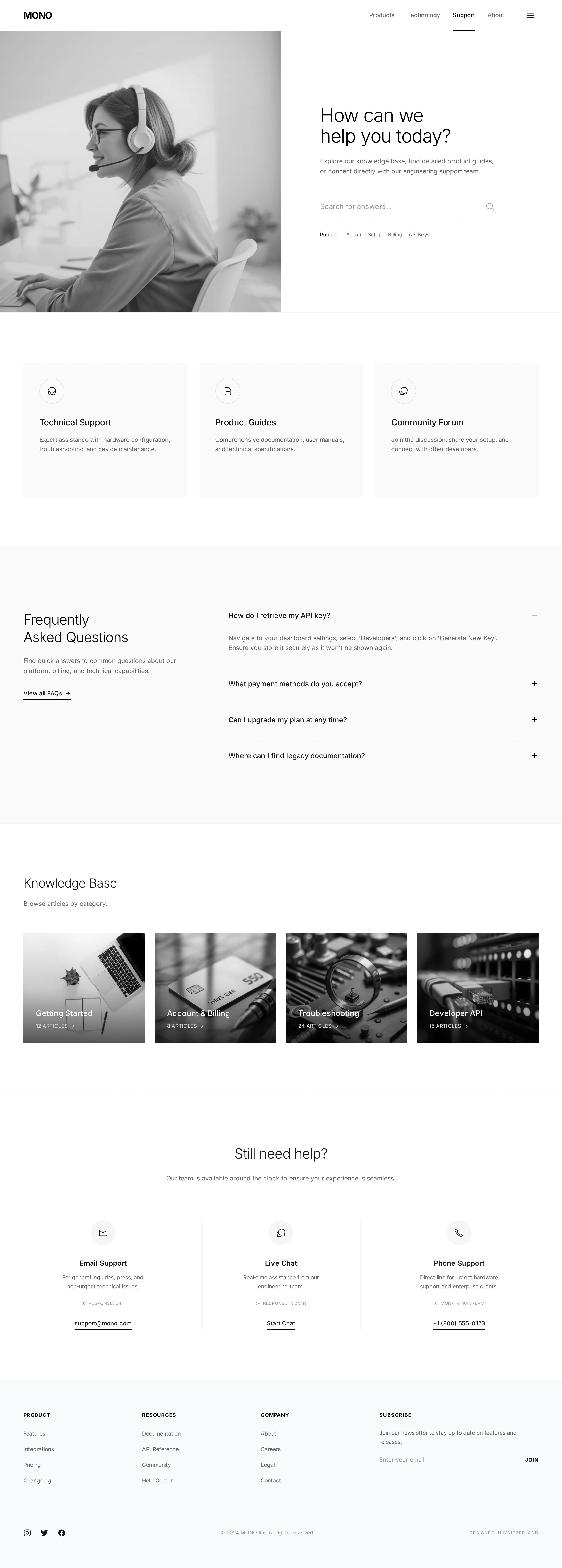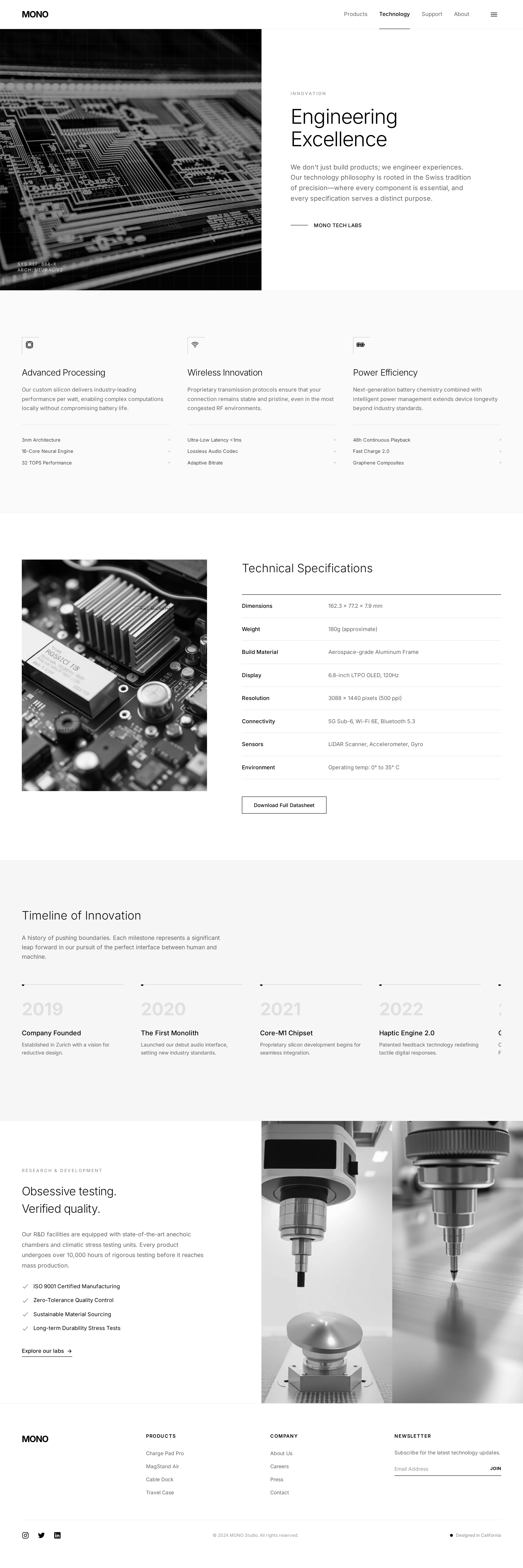 MONO is a minimalist tech accessories brand website showcasing premium wireless charging products. This case features a complete brand experience including landing page, technology, support, and about pages, all designed with monochromatic palette, Swiss design influence, and generous whitespace.