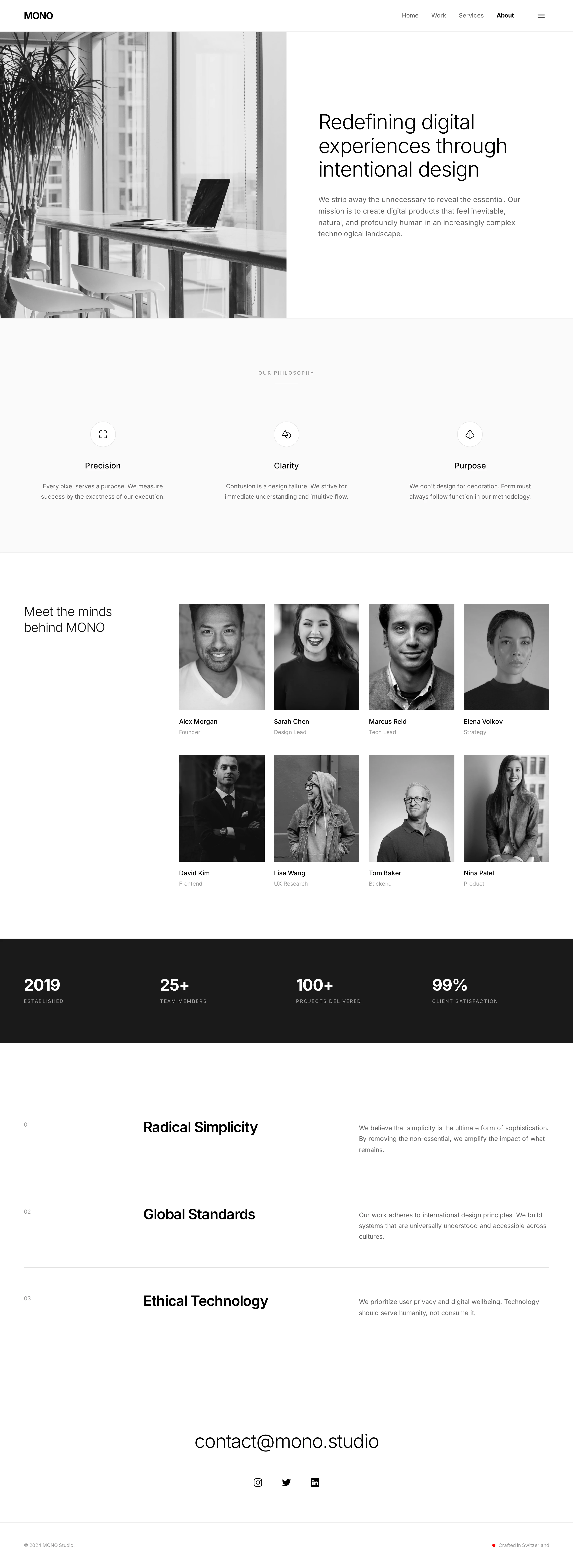 Swiss design influence, perfect alignment, generous whitespace.
