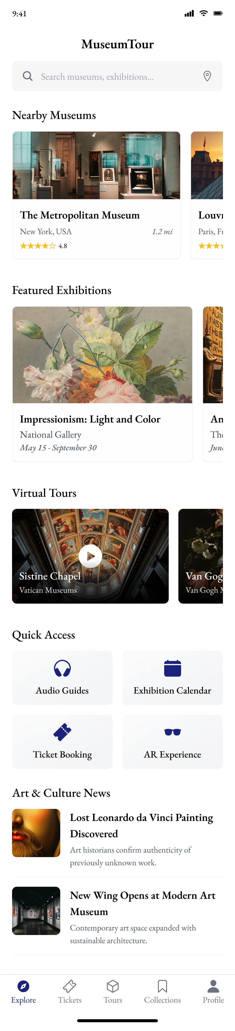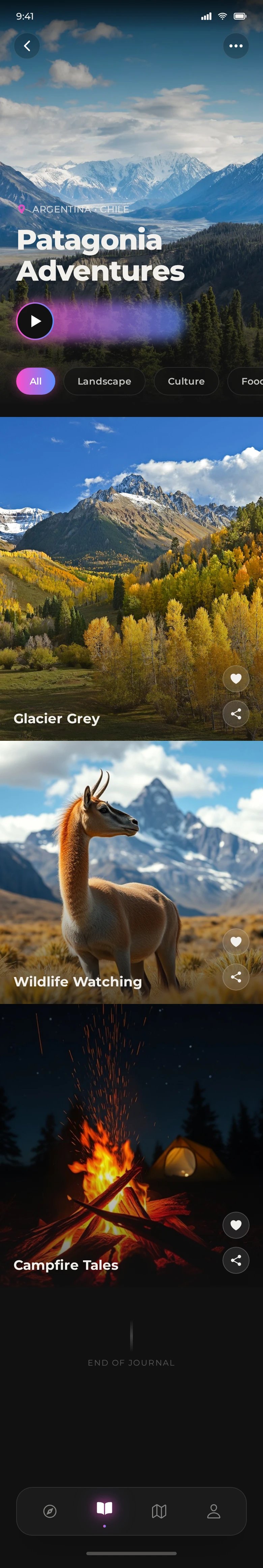- Scrollable image-centric story feed (full-width cards) with minimal text