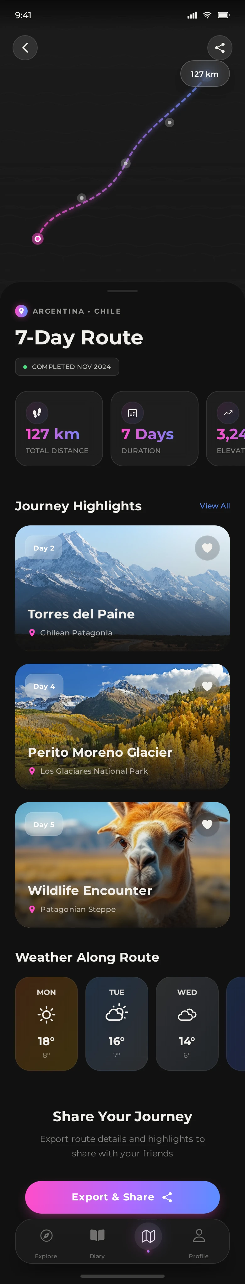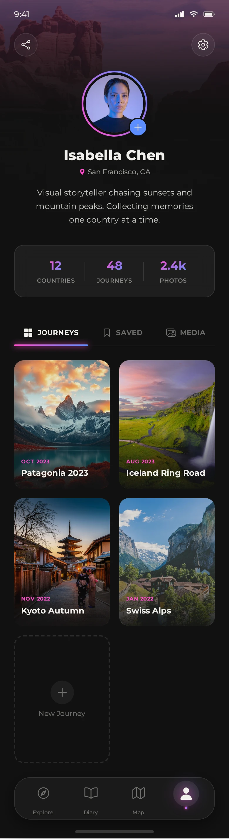 A mobile photo diary app for world travelers showcasing cinematic travel storytelling. This case features a complete travel experience including home feed, immersive story layout, interactive journey map, explore discovery, and user profile, all designed with deep charcoal base, cream accents, and vibrant pink-to-blue gradient highlights.