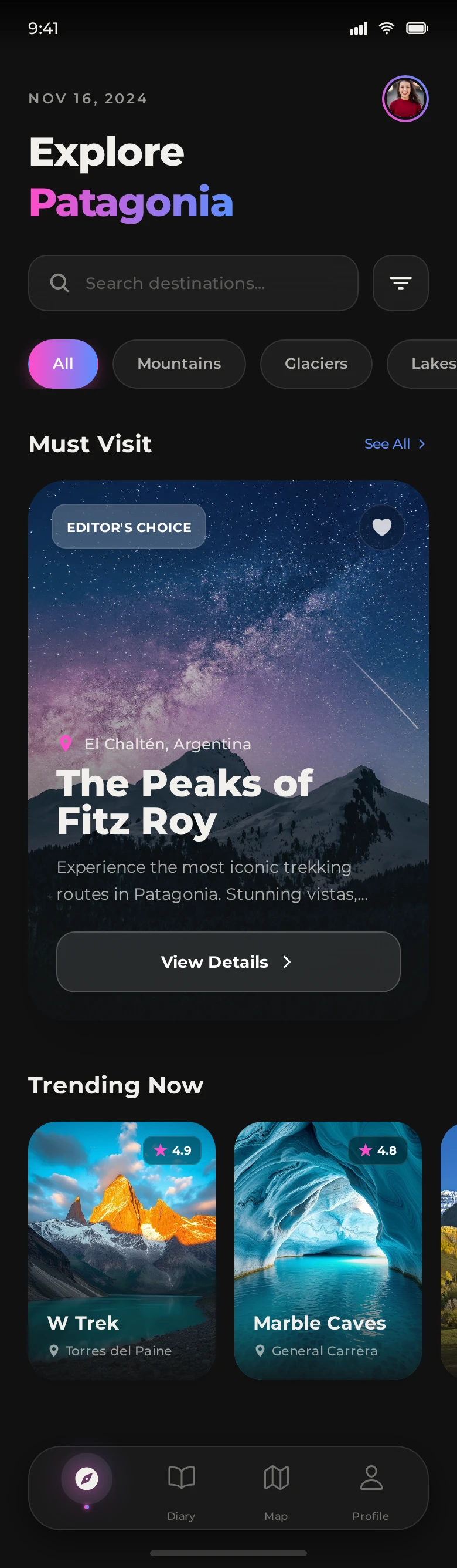 - Hero full-height travel photo with overlay title "Patagonia Adventures"