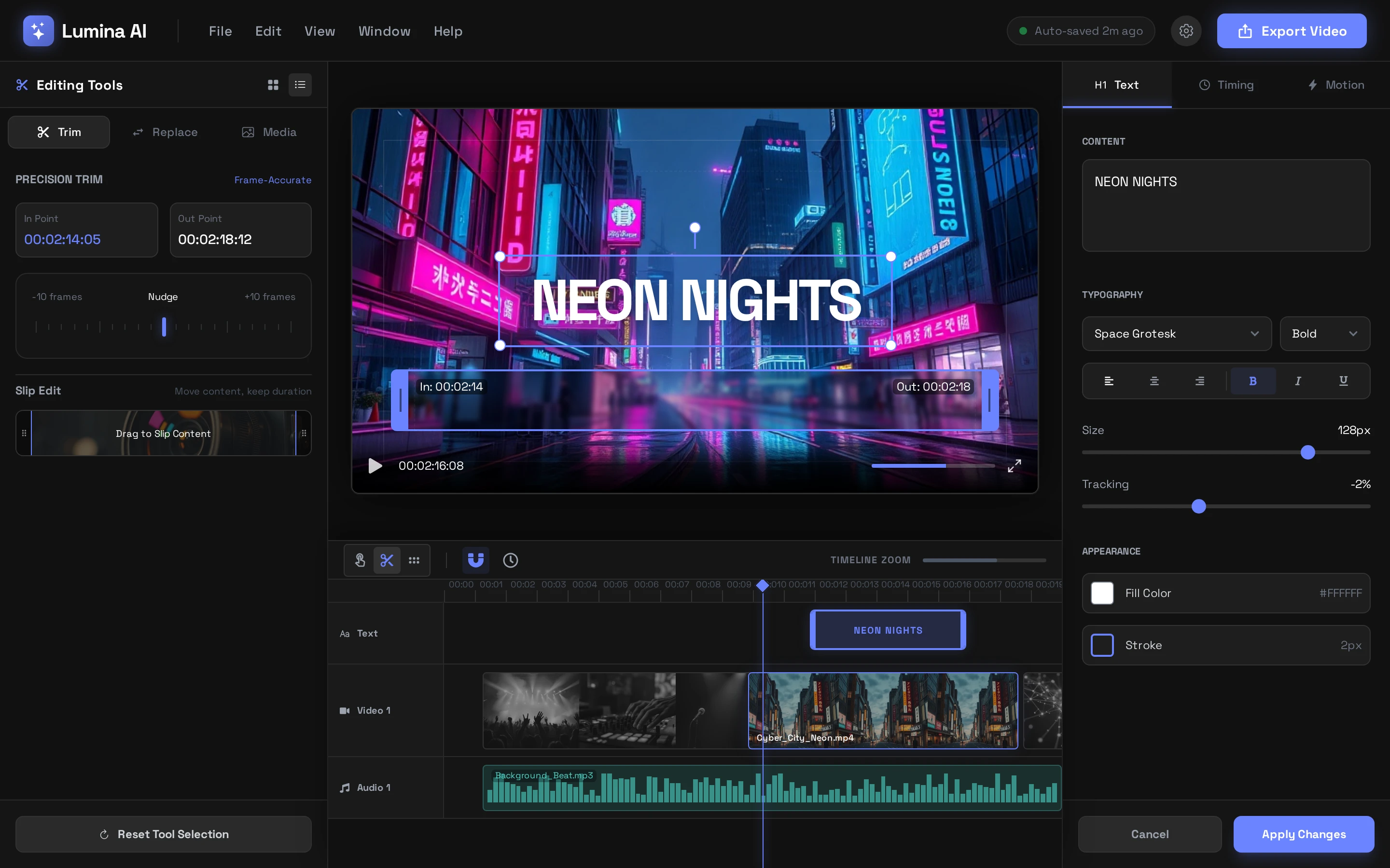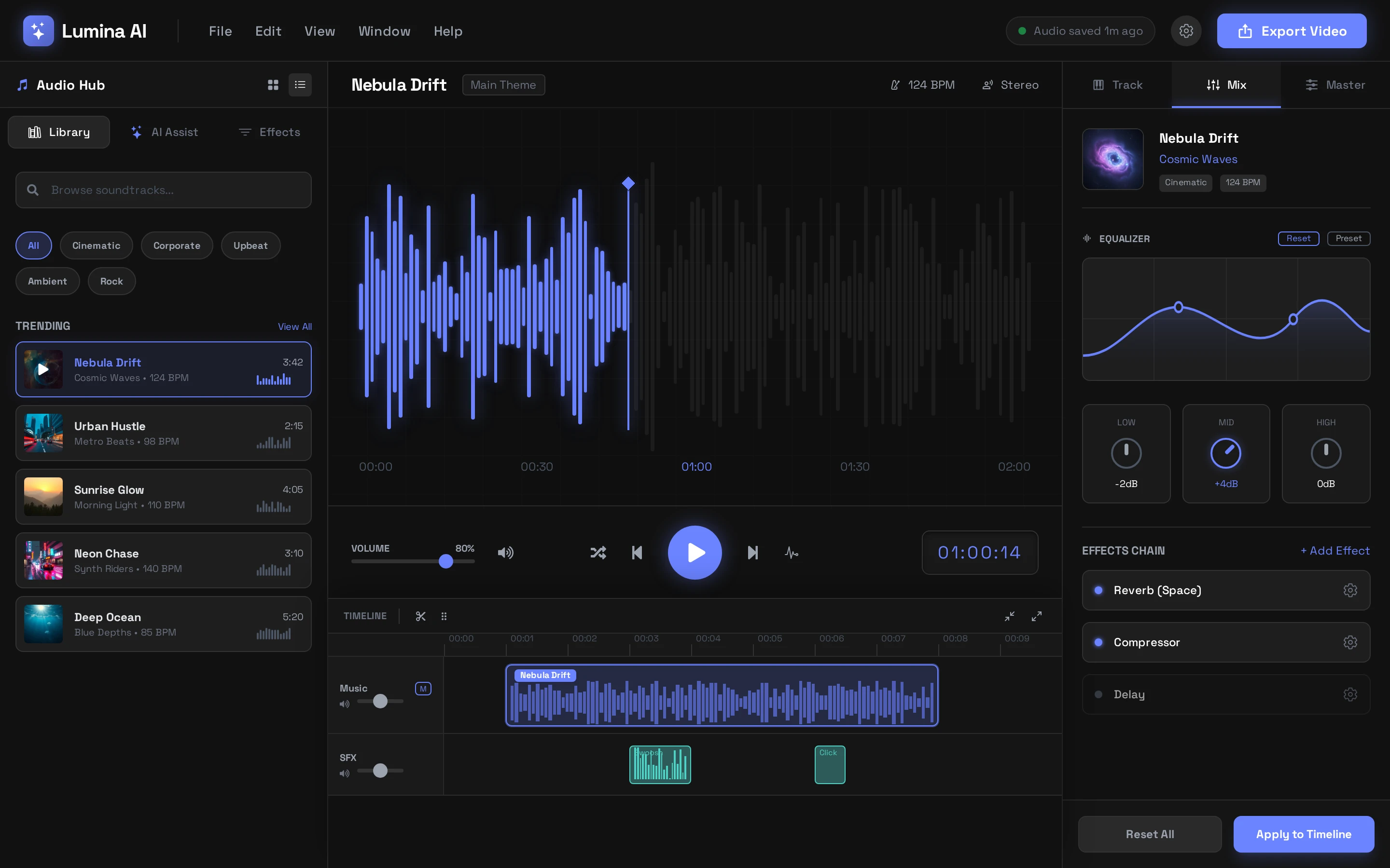 Users input a short prompt, and AI generates a dynamic promo video with cinematic transitions, large typography, and motion graphics similar to Google or Apple product launch videos. System also adds suitable background music automatically.