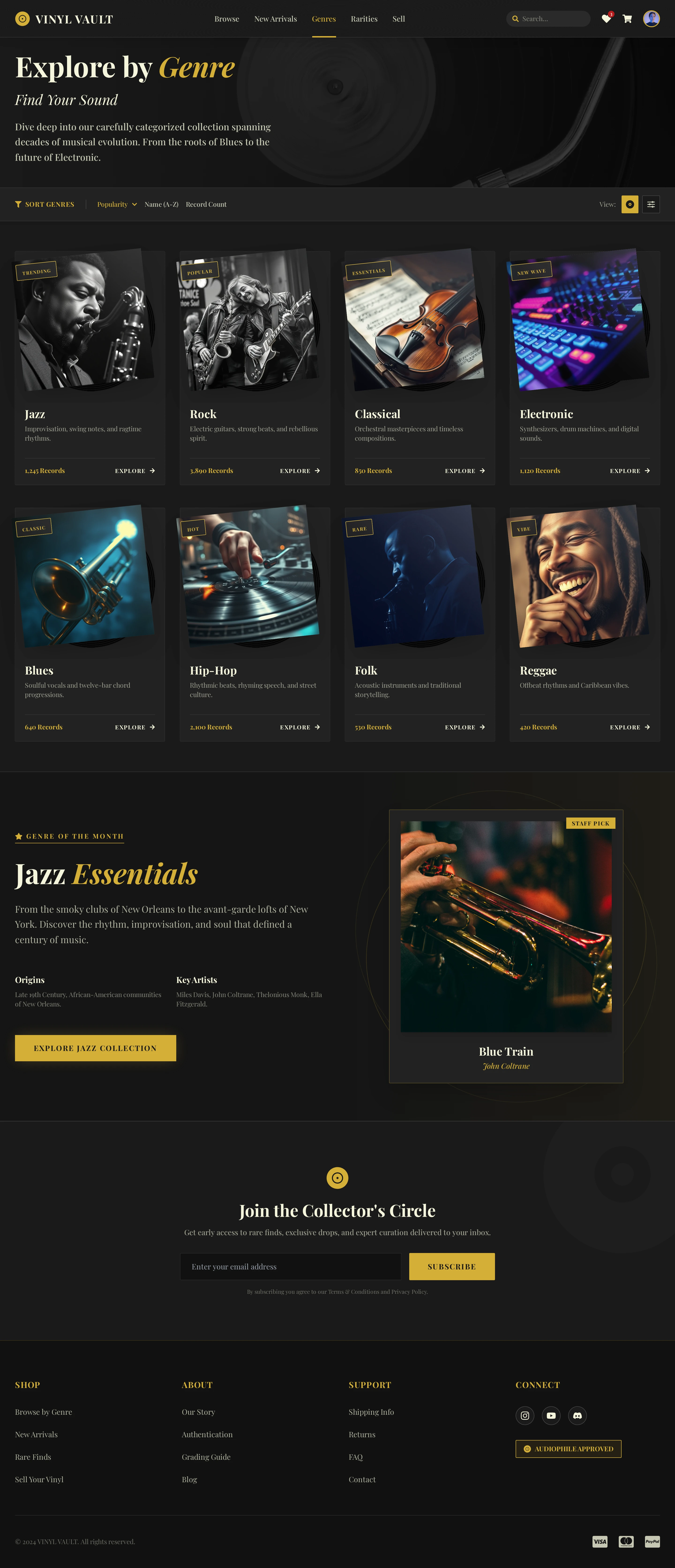- Top section: "Join the Collector's Circle" newsletter with vinyl record graphic, email input with gold submit button