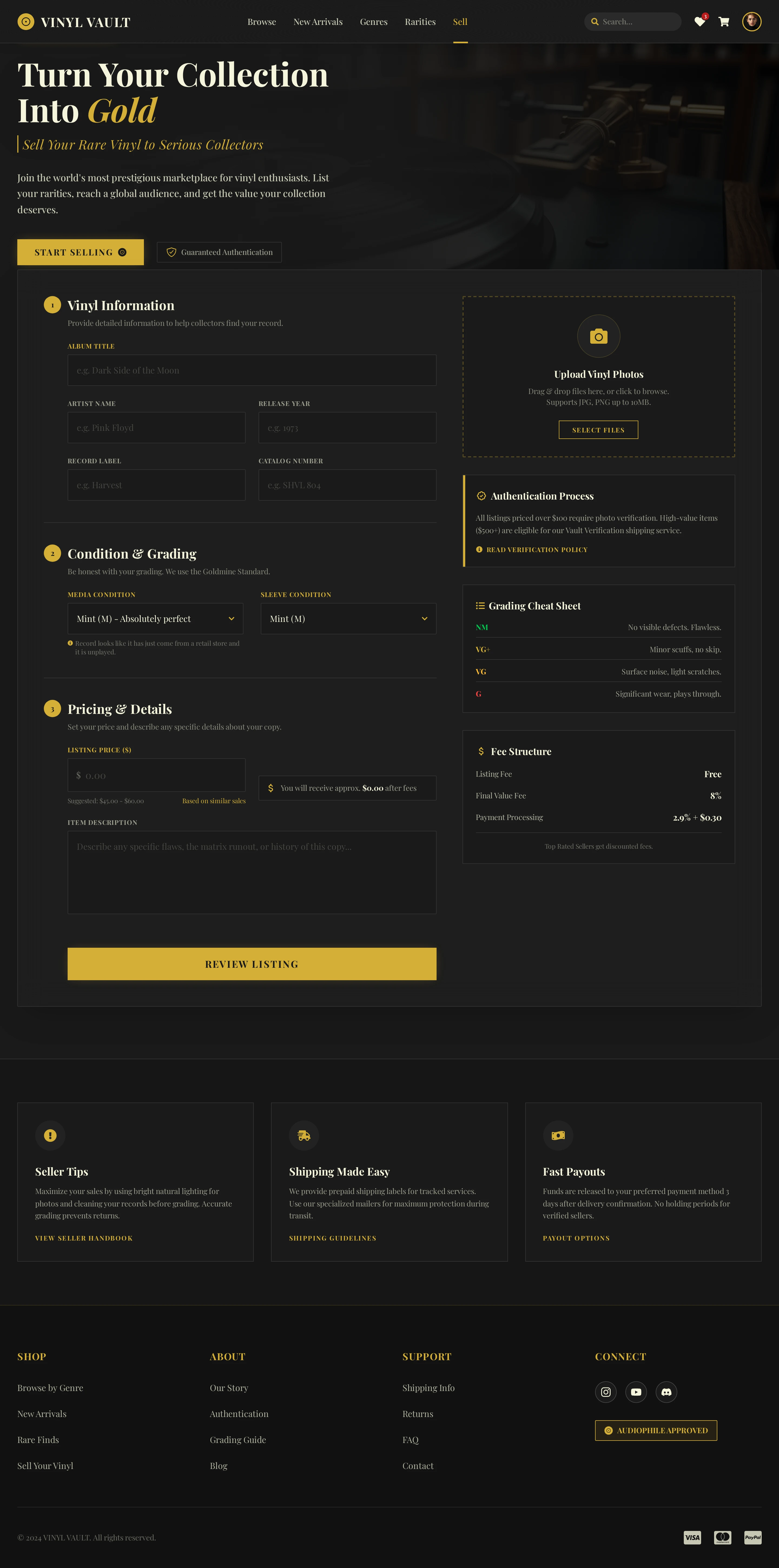 A Homepage for the vinyl records marketplace called VINYL VAULT.